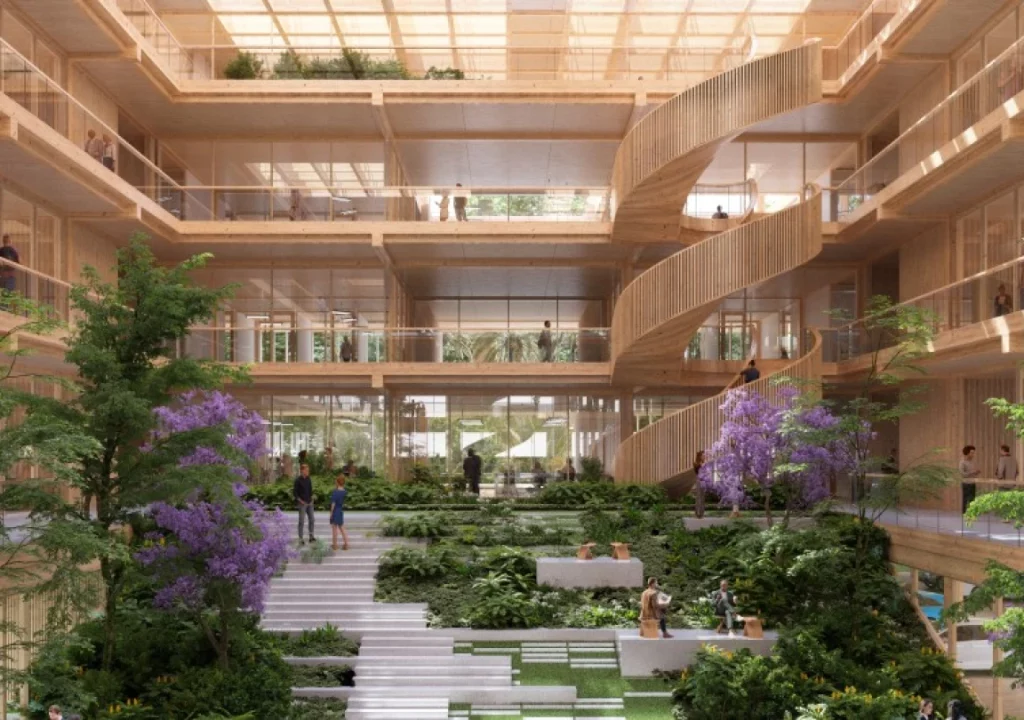 El diseño busca establecer una conexión urbana entre los espacios públicos y privados que lo rodean, integrando de forma coherente los volúmenes existentes, el parque Magallanes y el centro comercial y financiero de la Torre Pelli. El edificio, diseñado con estructura de madera, se organiza en torno a un patio ajardinado desde el cual se regula el clima interior mediante el control de la radiación y la ventilación. En este caso, el paisajismo resulta crucial, trabajando con la vegetación en planos verticales y horizontales para difuminar los límites entre los espacios interiores y exteriores del edificio.