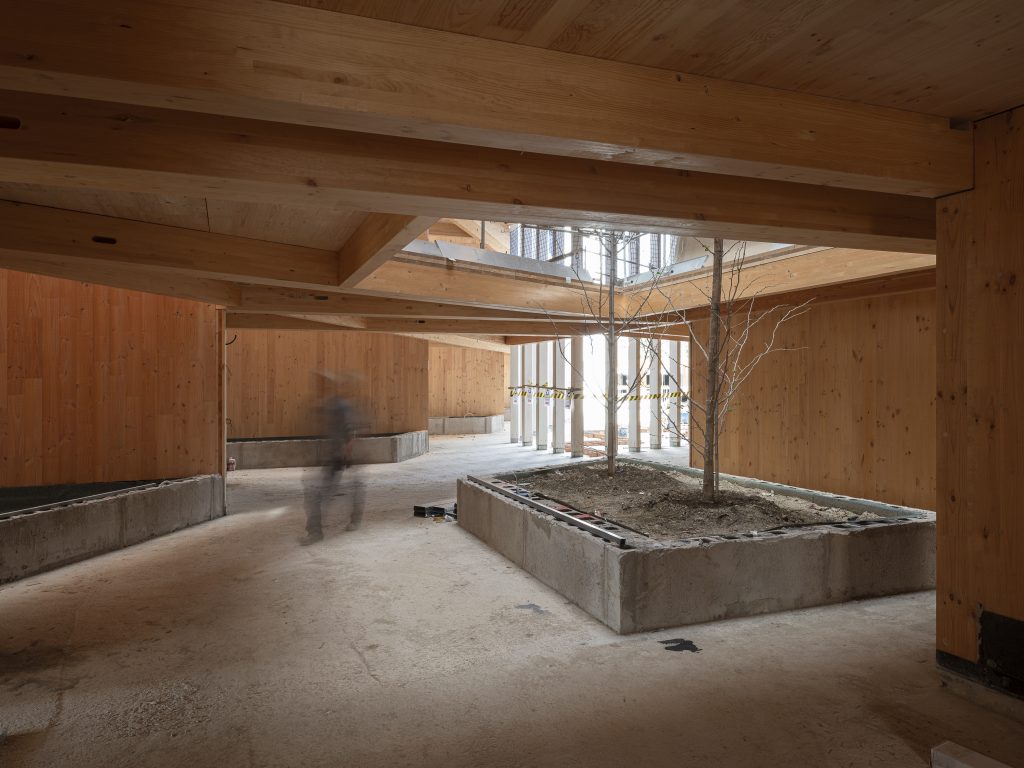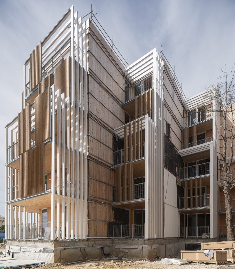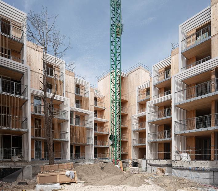 En Oceanika, proyectado por Bakpak Architects, esta estrategia alcanza su máxima expresión. Con 3.500 m³ de madera certificada procedente de bosques sostenibles, el edificio almacena unas 3.500 toneladas de CO₂ y reduce más del 60 % las emisiones frente a un sistema convencional. Su construcción industrializada y en seco permitió disminuir un 50 % los residuos, ahorrar agua y energía y acortar en seis meses los plazos de ejecución.