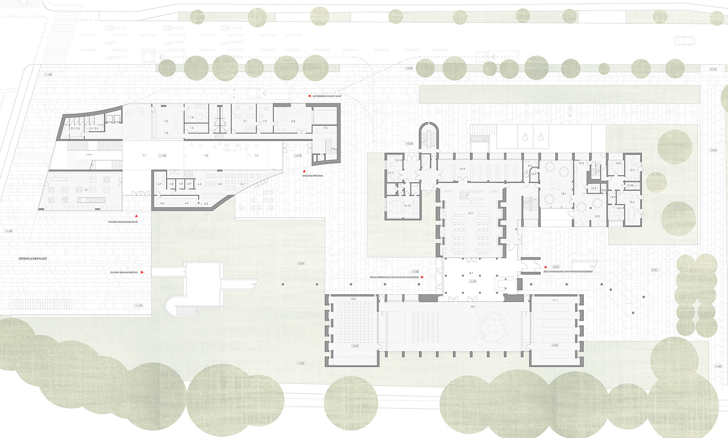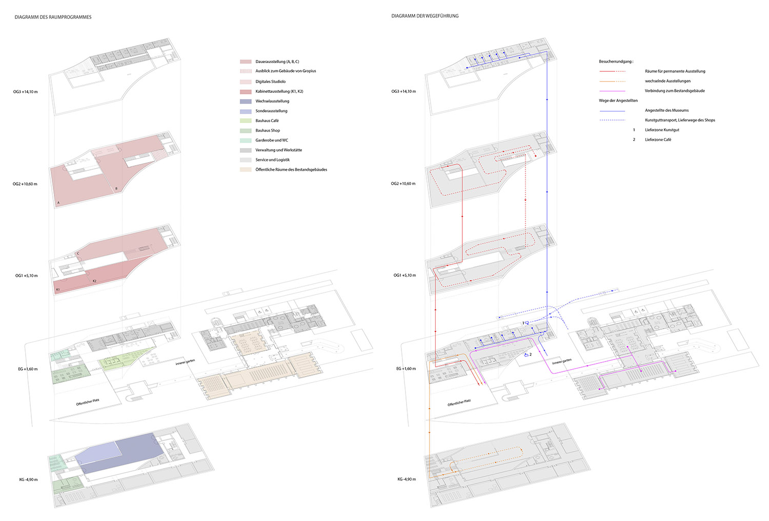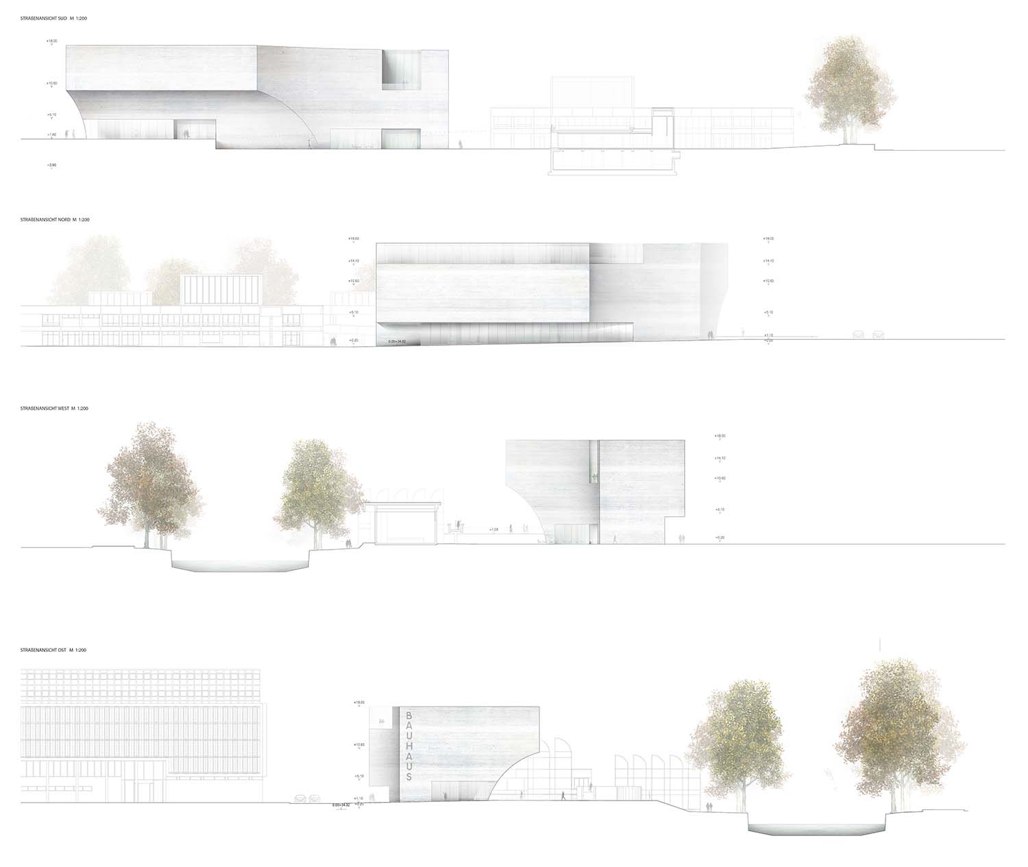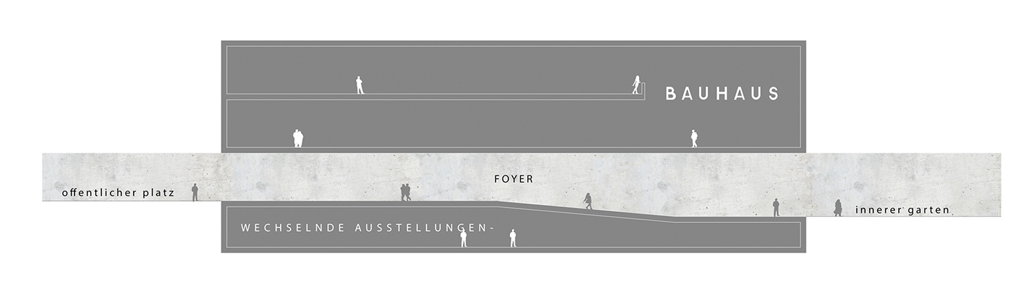 La propuesta establece un diálogo directo con el edificio original de Walter Gropius mediante dos operaciones geométricas que esculpen el volumen del nuevo museo. Una curva cóncava, derivada de los techos en diente de sierra del Bauhaus Archiv, configura tanto la sección del nuevo edificio como la geometría de su acceso principal, orientado hacia la plaza pública.