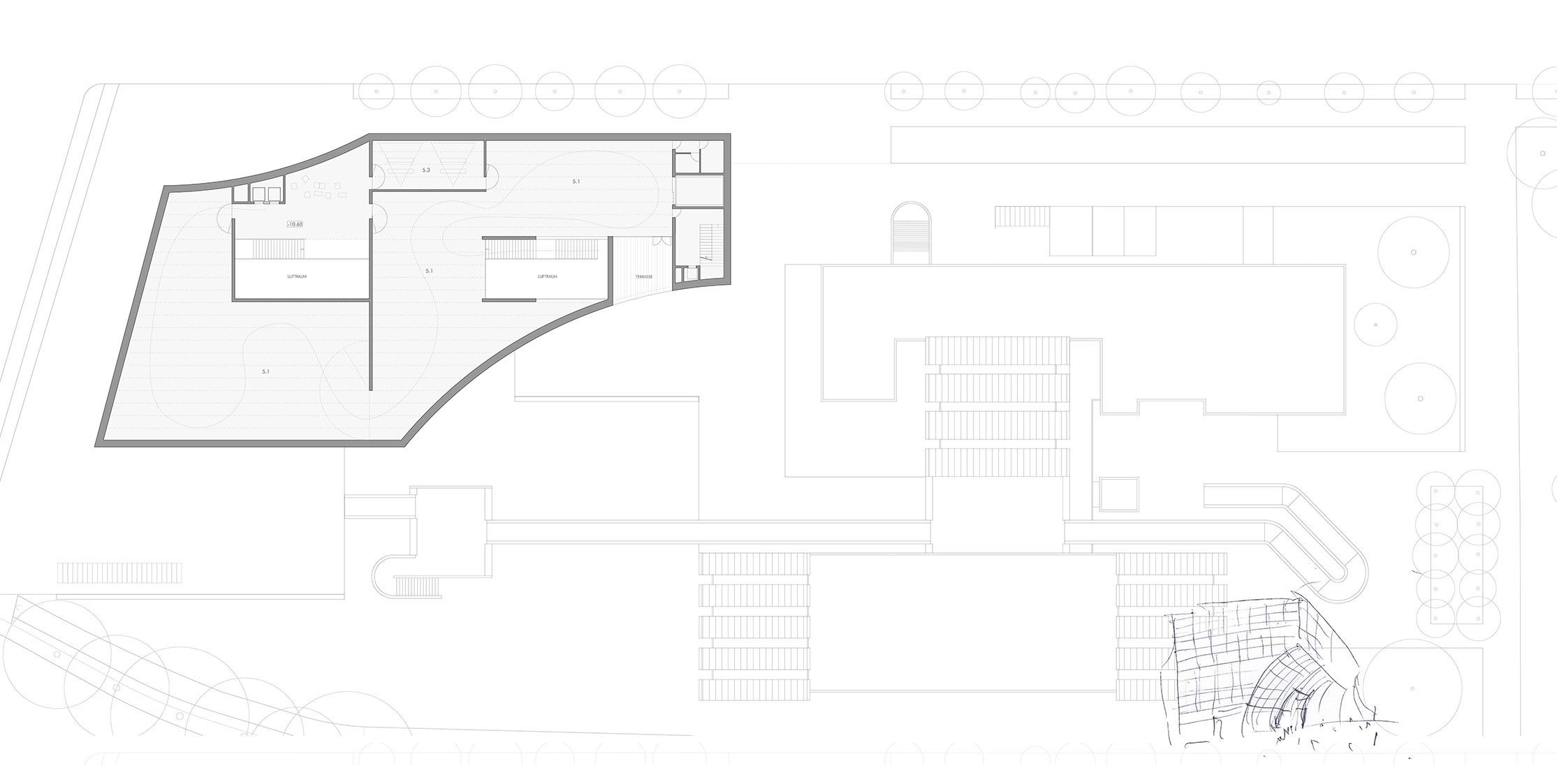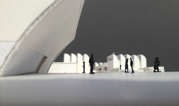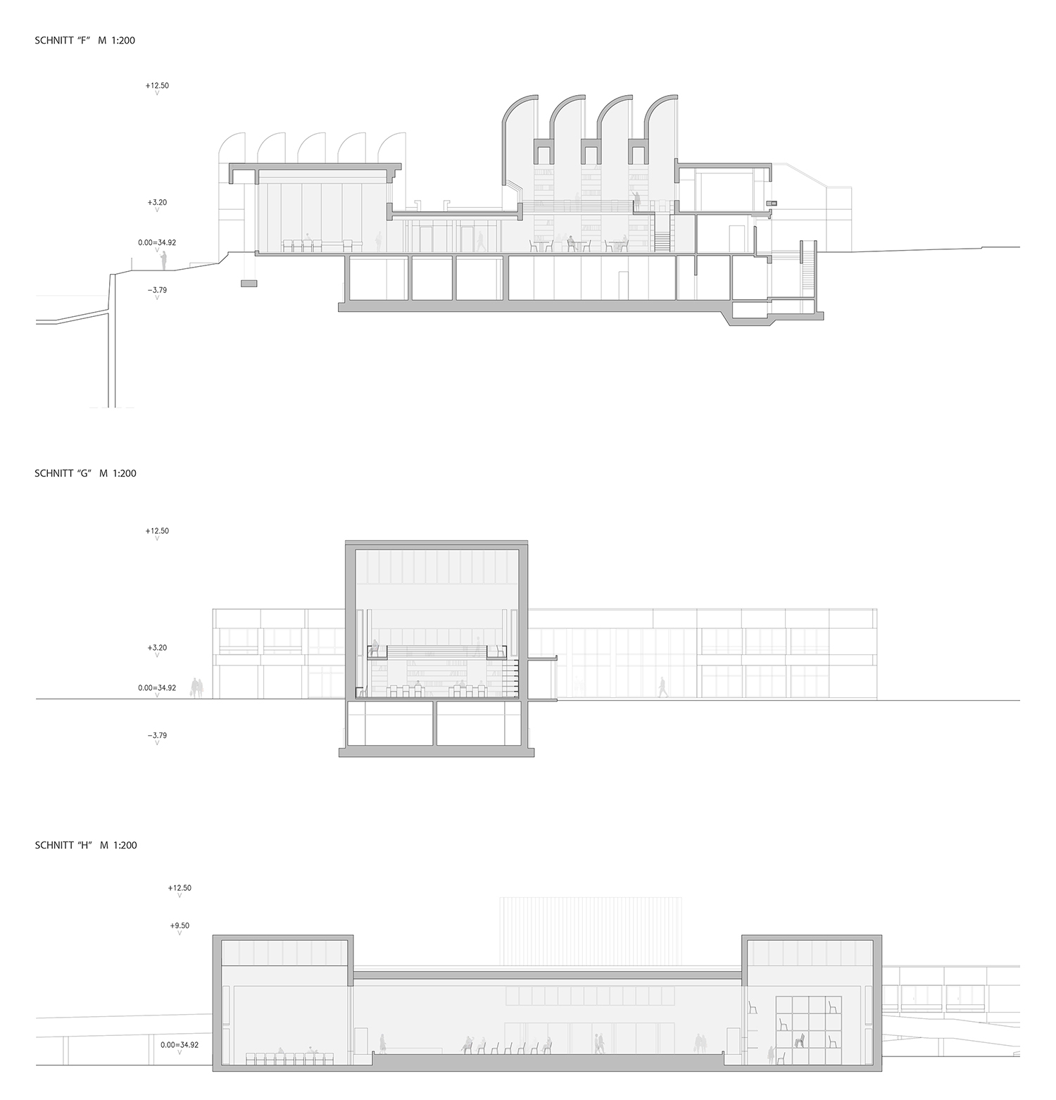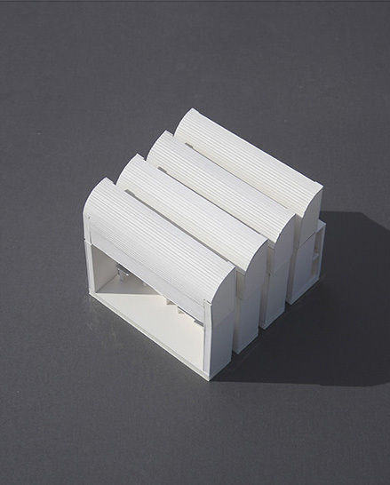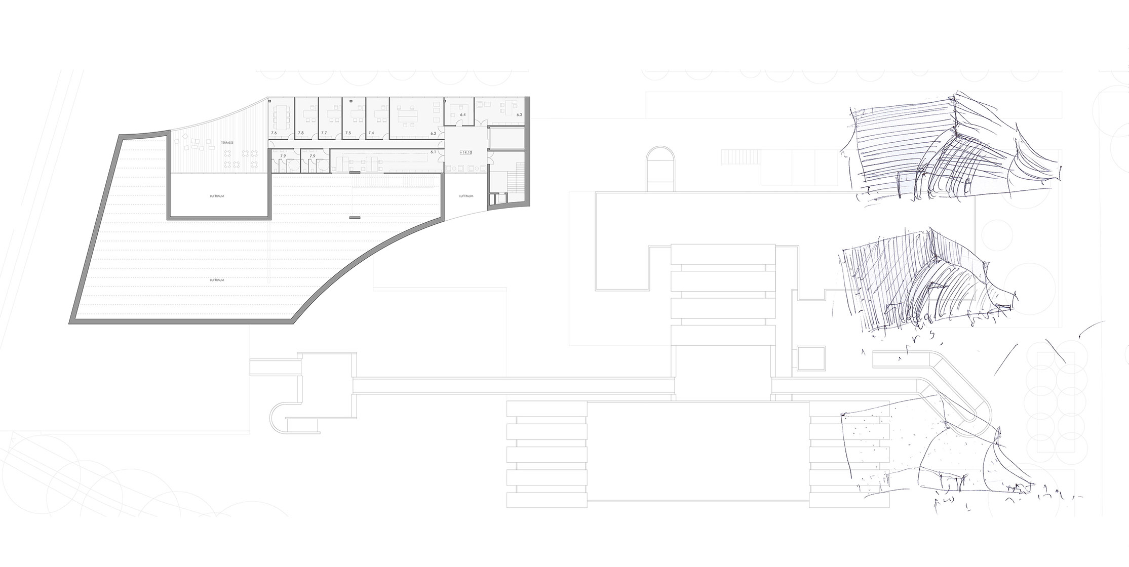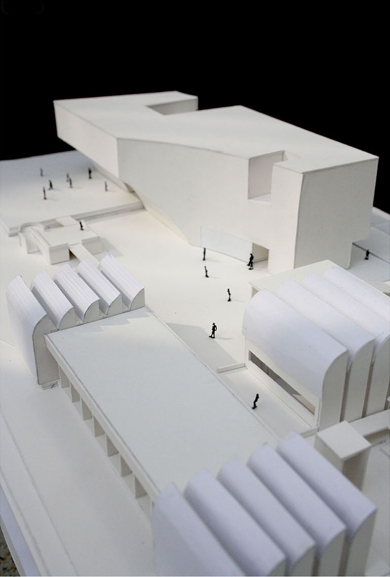 La propuesta establece un diálogo directo con el edificio original de Walter Gropius mediante dos operaciones geométricas que esculpen el volumen del nuevo museo. Una curva cóncava, derivada de los techos en diente de sierra del Bauhaus Archiv, configura tanto la sección del nuevo edificio como la geometría de su acceso principal, orientado hacia la plaza pública.