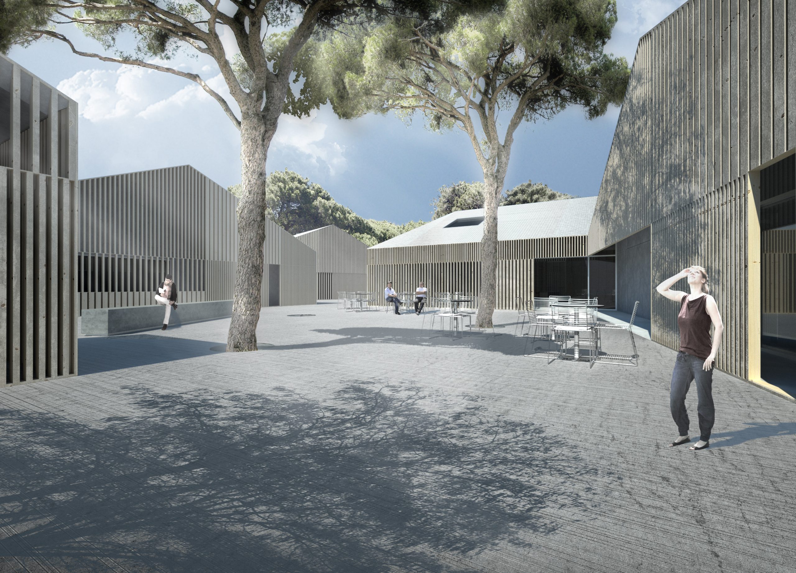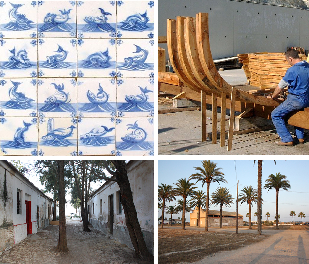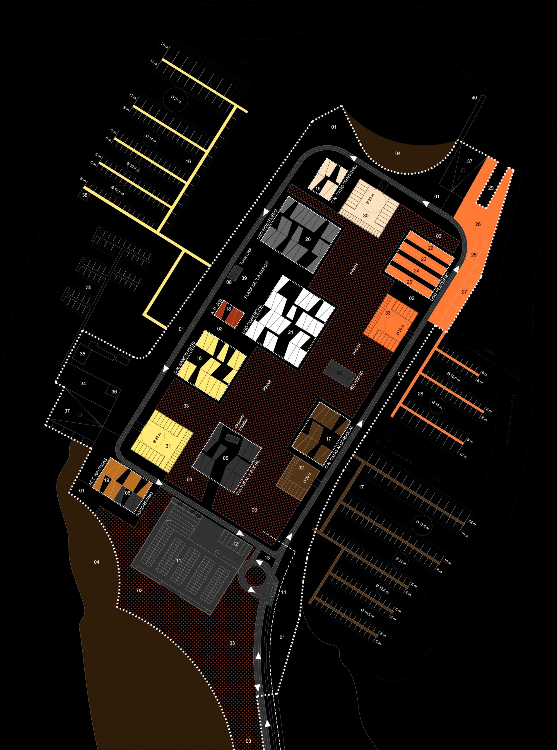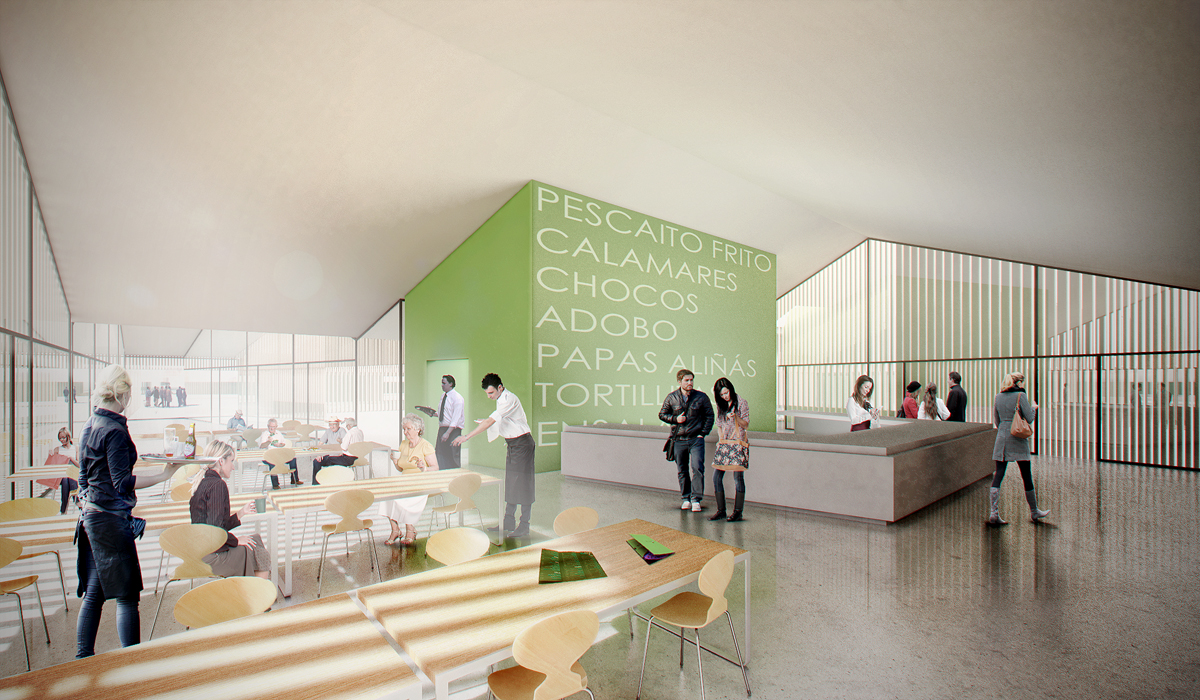 La intervención se organiza en 13 conjuntos compactos de usos tematizados, conectados entre sí mediante una red de calles y plazas que reproduce la escala y complejidad propias de un poblado. Hacia el exterior, las fachadas blancas aportan continuidad visual con el paisaje; hacia el interior, las celosías de madera de pino remiten a la tradición de los carpinteros de ribera.