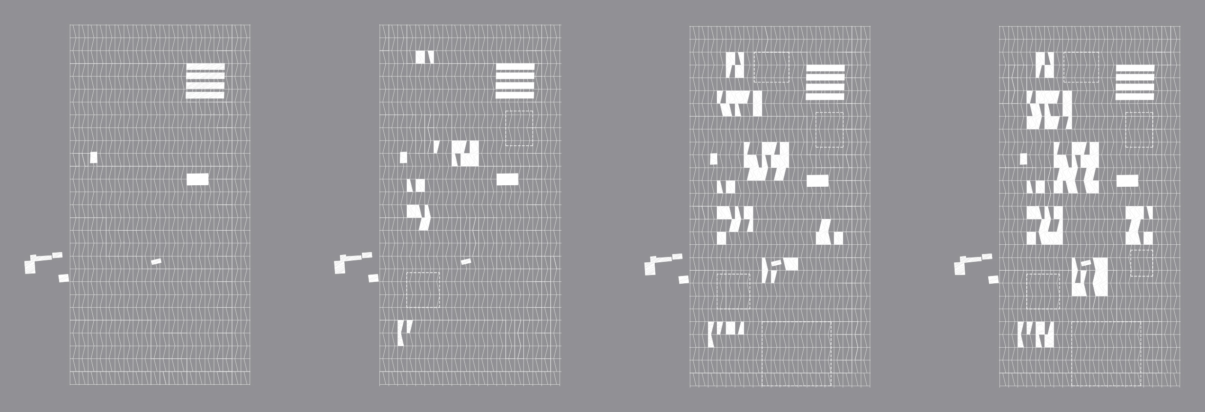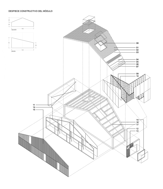 La propuesta se articula a partir de un módulo mínimo de 78 m² cuya estructura metálica permite un sistema constructivo prefabricado, flexible y económico. La adición de estos módulos —en versión genérica o de borde— genera un tejido urbano que combina identidad, eficiencia y adaptación al entorno.
