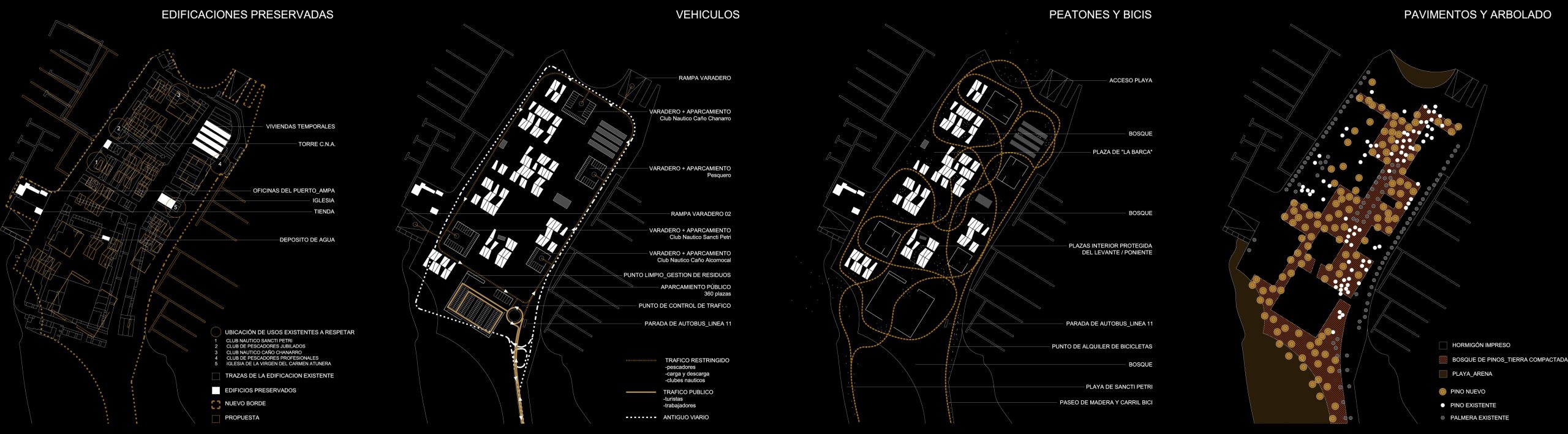 El proyecto recupera la esencia del histórico poblado atunero de Sancti Petri reinterpretando su arquitectura industrial original. Las naves blancas, las cubiertas inclinadas y los hastiales repetidos sirven como punto de partida para un nuevo planteamiento que reconstruye el carácter perdido de la península.