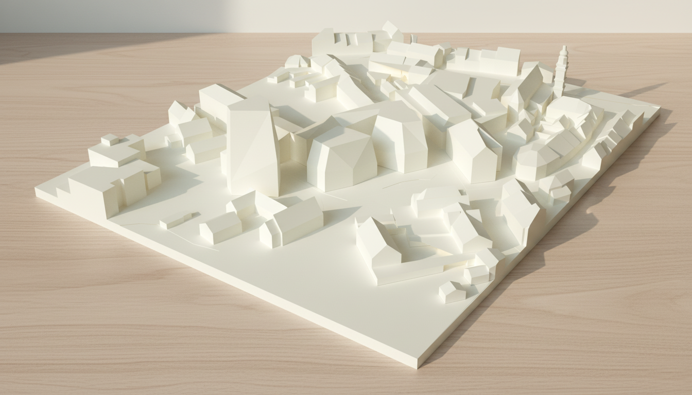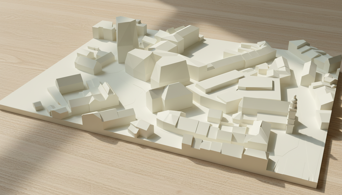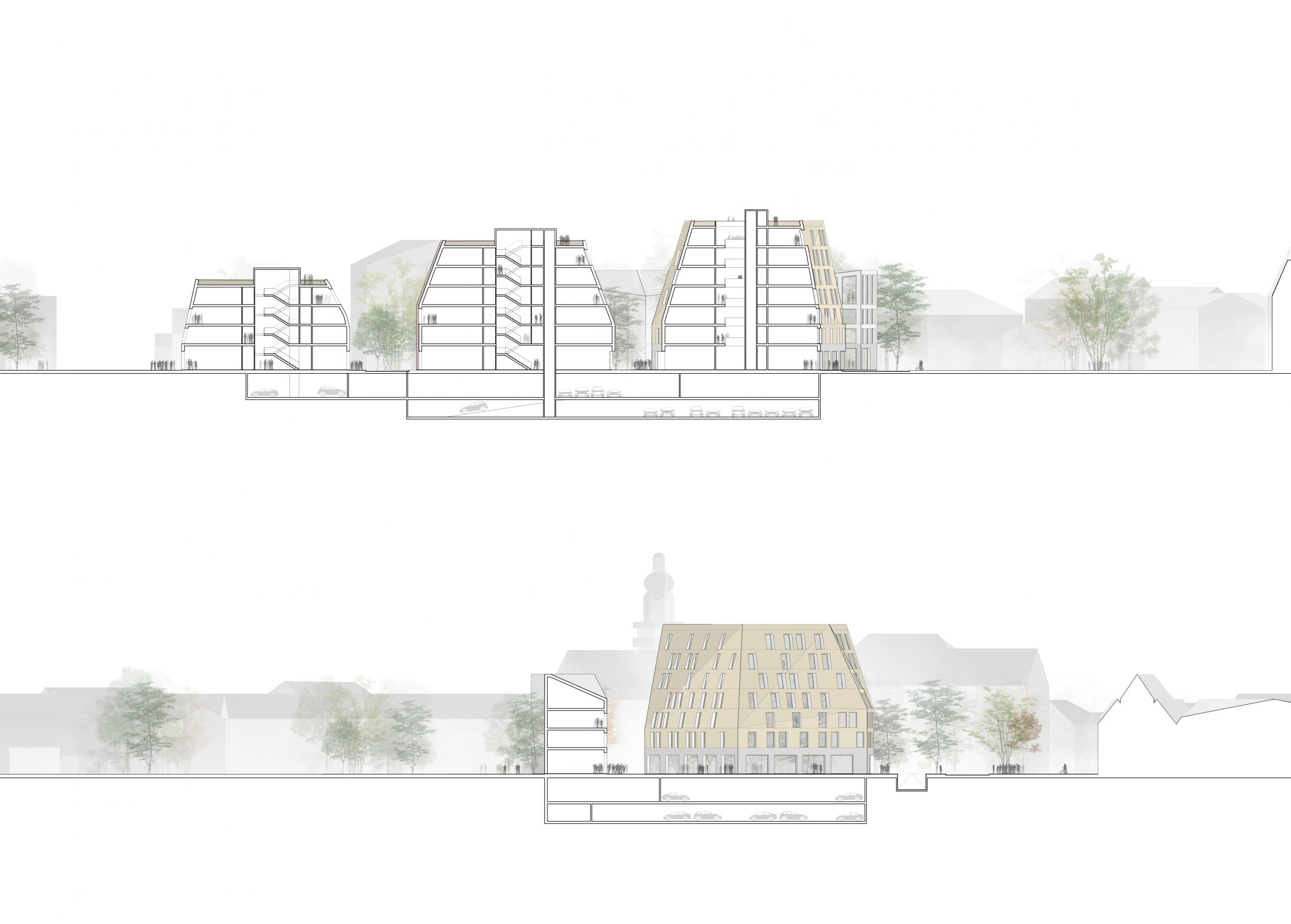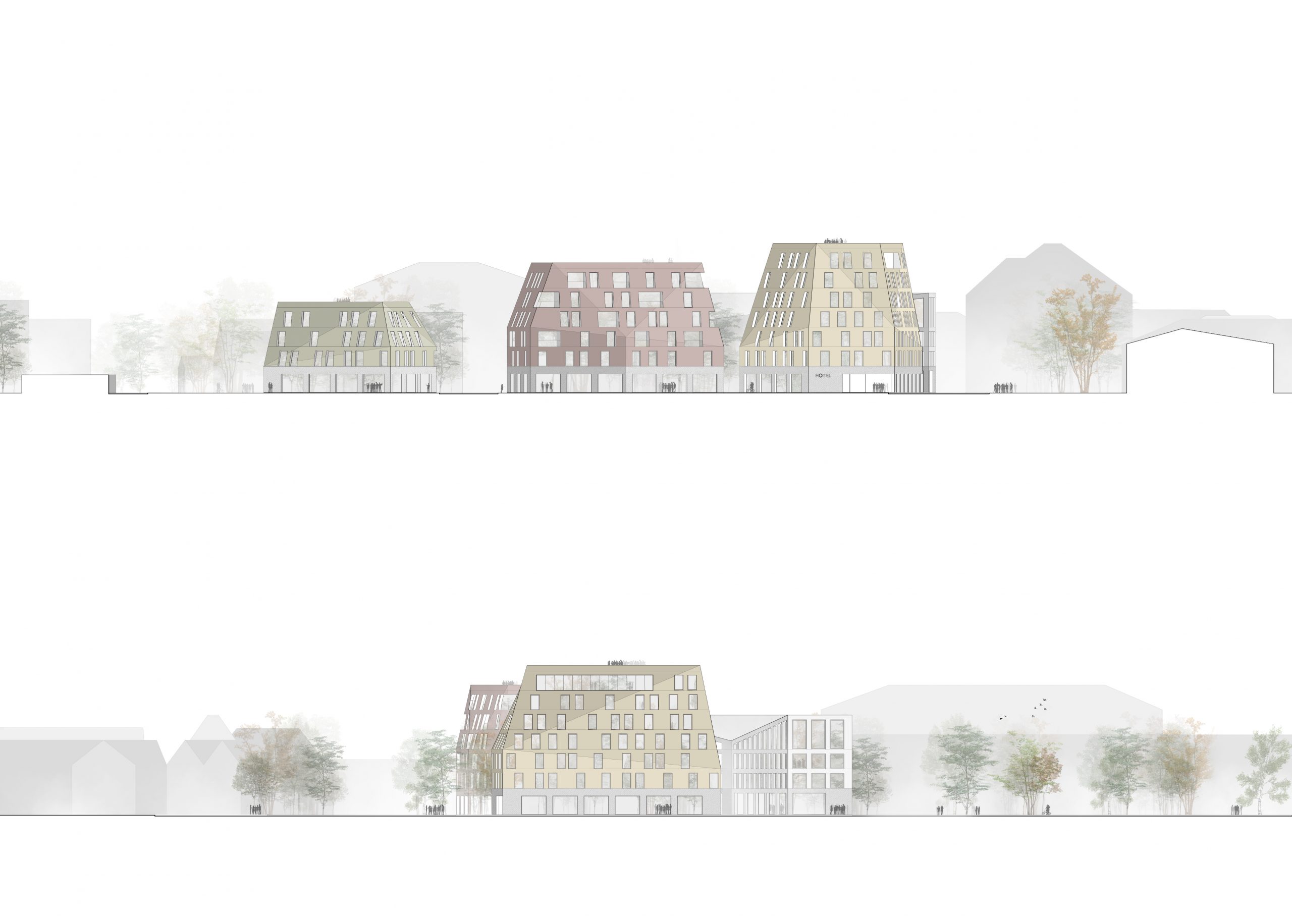 La propuesta apuesta por un lenguaje contemporáneo que interpreta la tradición local a través de cubiertas quebradas, aperturas moduladas y el uso de materiales de carácter sobrio. Las fachadas, tratadas con variaciones de color y textura, contribuyen a diversificar la imagen del conjunto y reforzar su presencia urbana. El proyecto no solo resuelve la densidad y el programa mixto, sino que también incorpora espacios públicos y semi-públicos que fomentan la vida social, generando un ámbito dinámico y multifuncional en el corazón de Deggendorf.