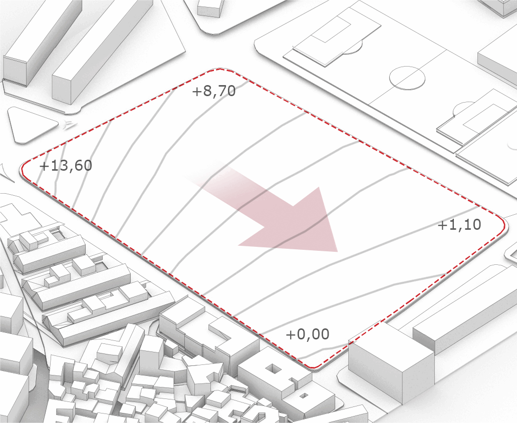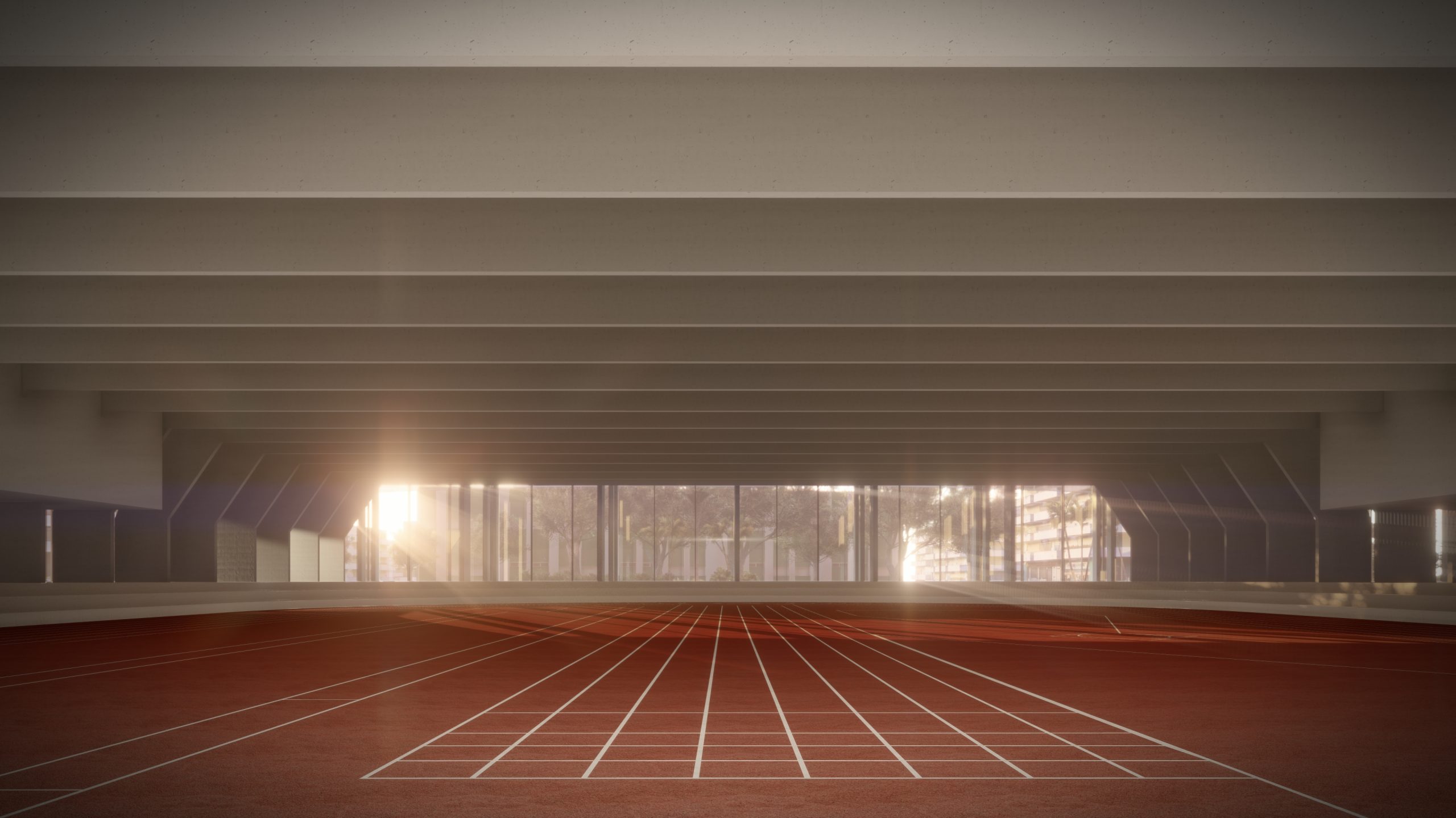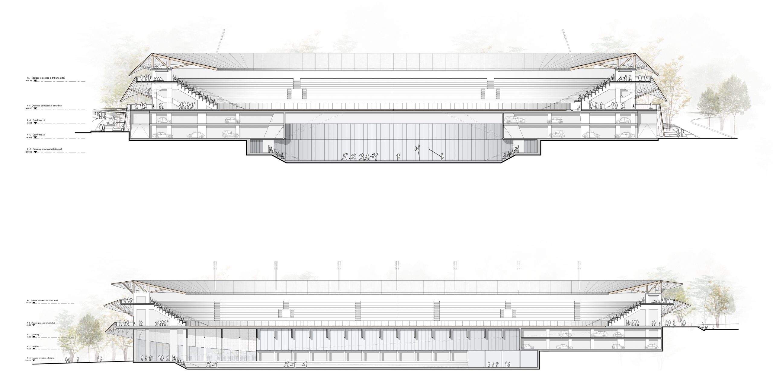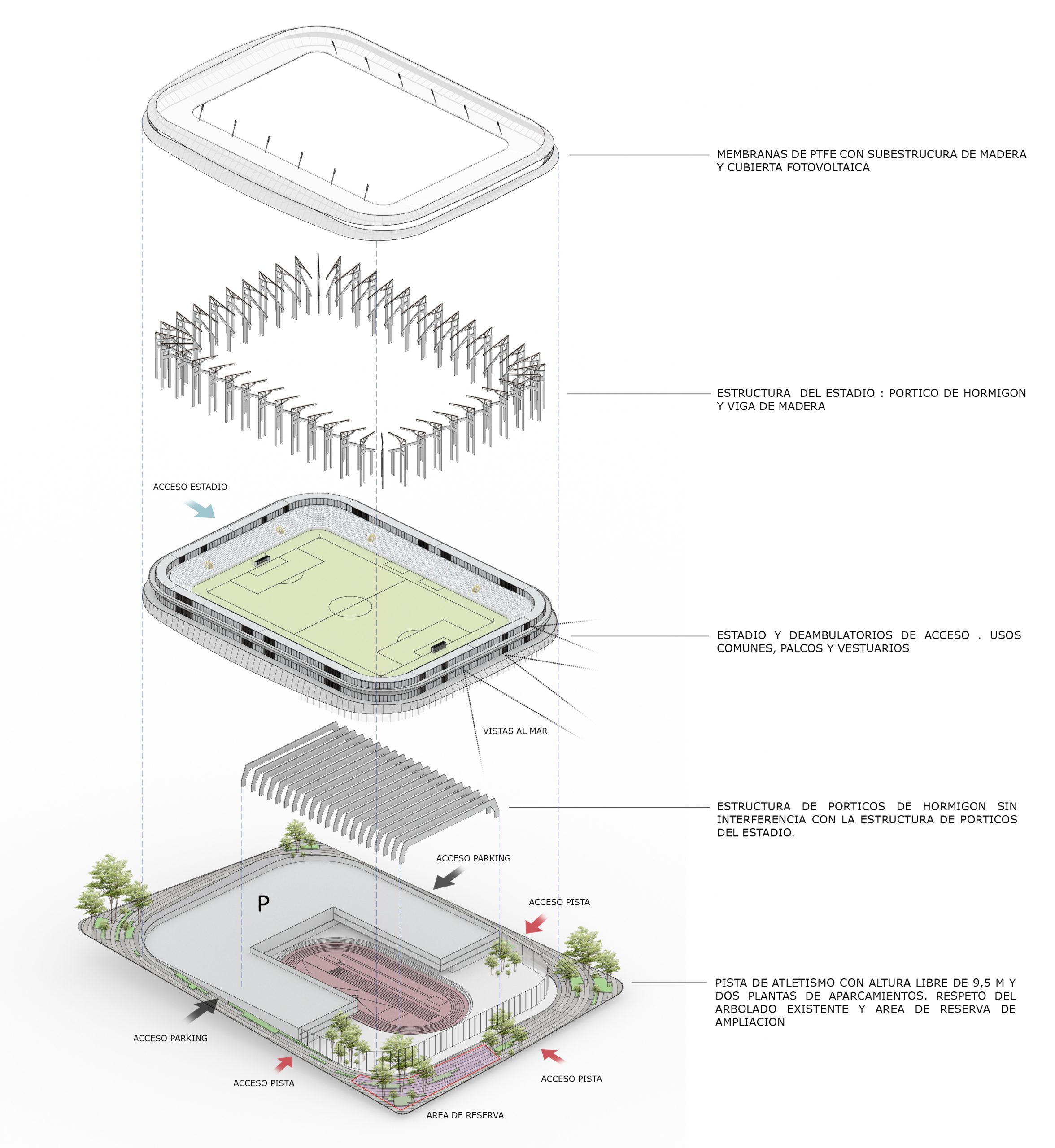 El estadio se configura a través de un sistema de plataformas superpuestas que aprovechan el terreno para articular los distintos usos: en la cota más alta, el acceso principal y las gradas del campo de fútbol; en niveles intermedios, el aparcamiento; y en la cota inferior, una pista de atletismo cubierta de dimensiones reglamentarias. Esta estrategia permite integrar el programa en el lugar, optimizar circulaciones y generar una volumetría horizontal que se abre a la ciudad y al paisaje.