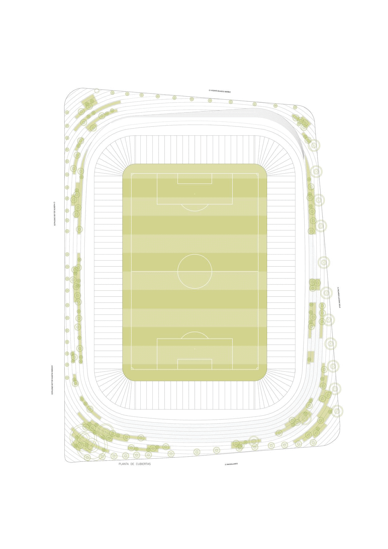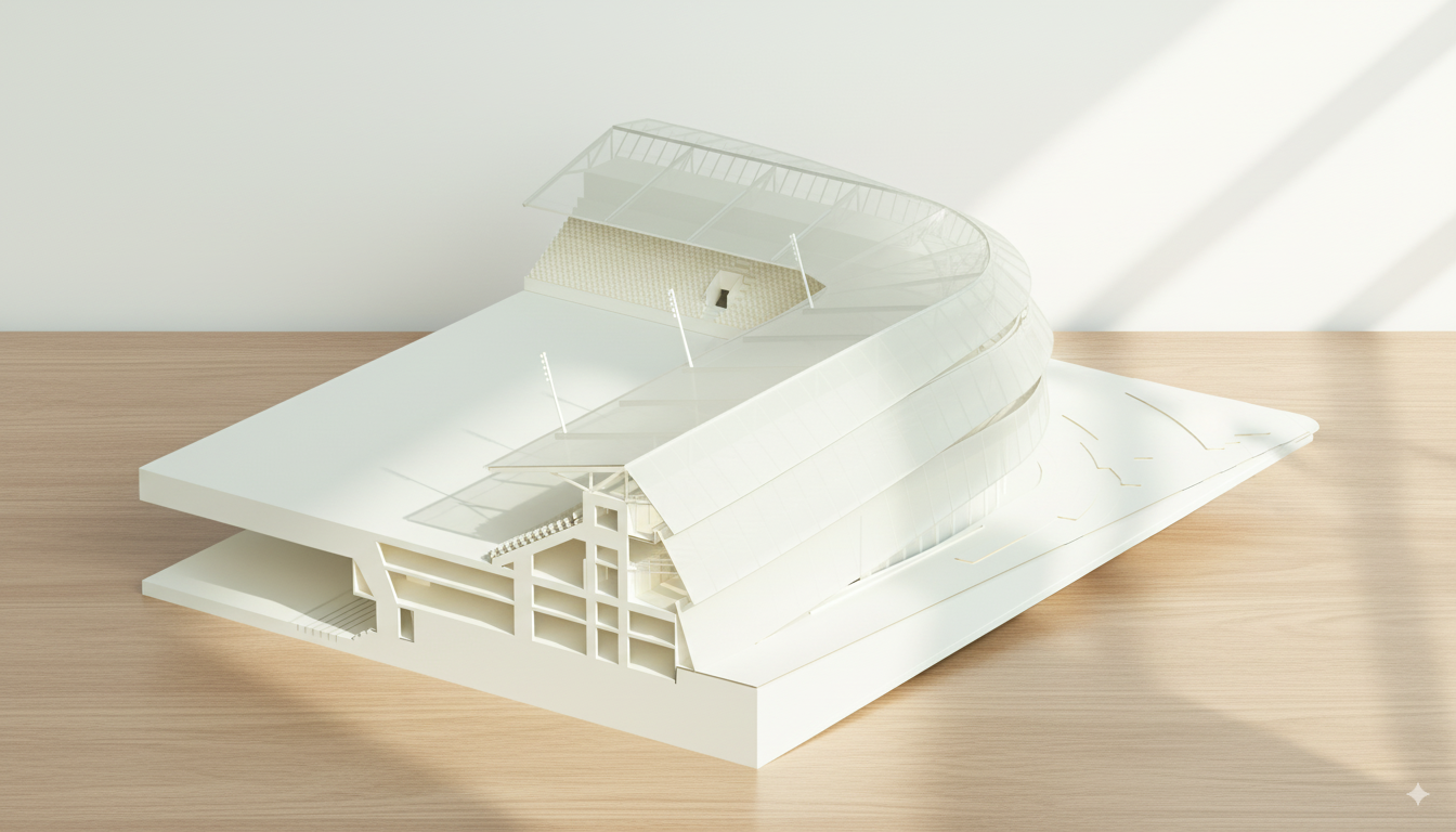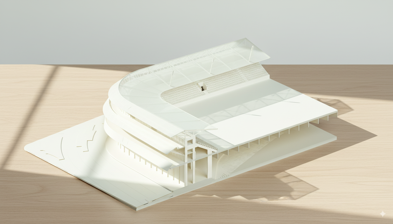 La racionalidad y la modulación estructural son principios rectores del diseño. Pórticos de hormigón armado, forjados prefabricados y gradas modulares garantizan un sistema constructivo eficiente, flexible y económico. La cubierta, ligera y continua, protege al 90% de los espectadores y se integra con la fachada en un gesto unitario que refuerza la condición abstracta y atemporal del estadio.