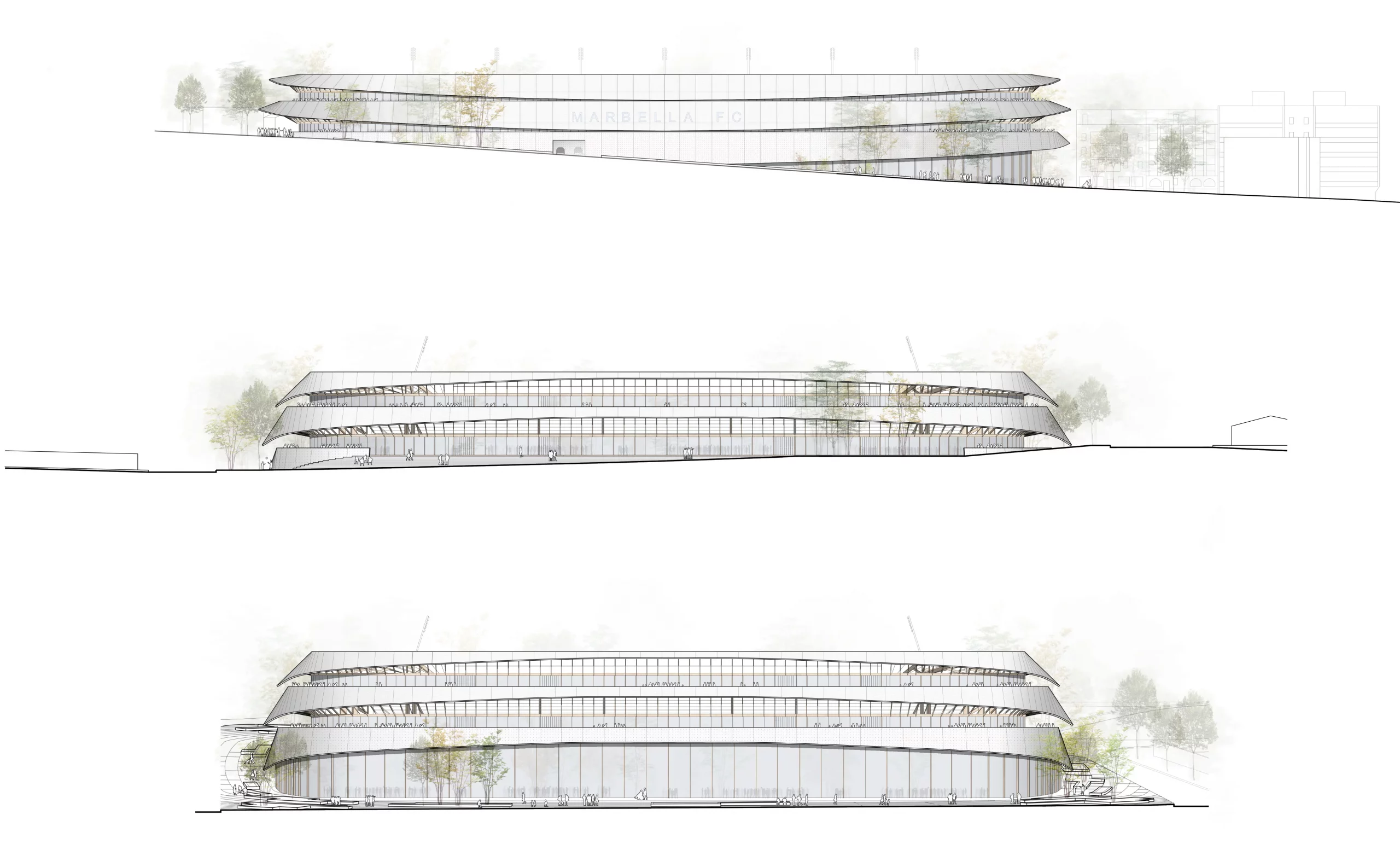 La propuesta busca una arquitectura atemporal, serena y sin edad, entendida como un objeto urbano que evoca permanencia frente al carácter efímero de los usos deportivos y culturales. El estadio se formaliza a partir de una piel continua y envolvente, concebida como un filtro que regula la relación interior–exterior, controla el soleamiento y aporta identidad al conjunto. Esta piel está resuelta mediante subestructura de madera y membranas tensadas de PTFE, inspiradas en las velas de los barcos y vinculadas a la memoria marítima de Marbella.