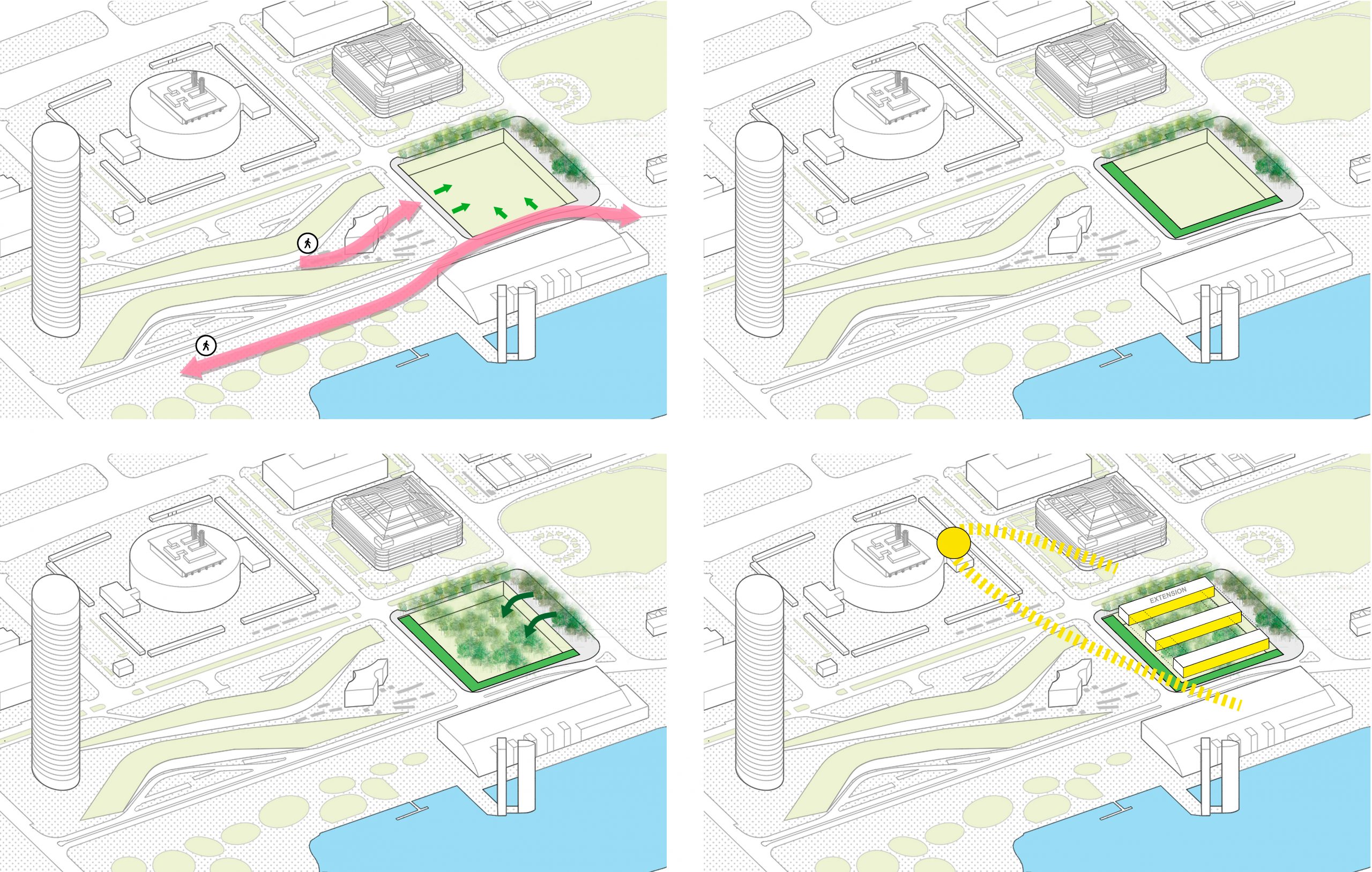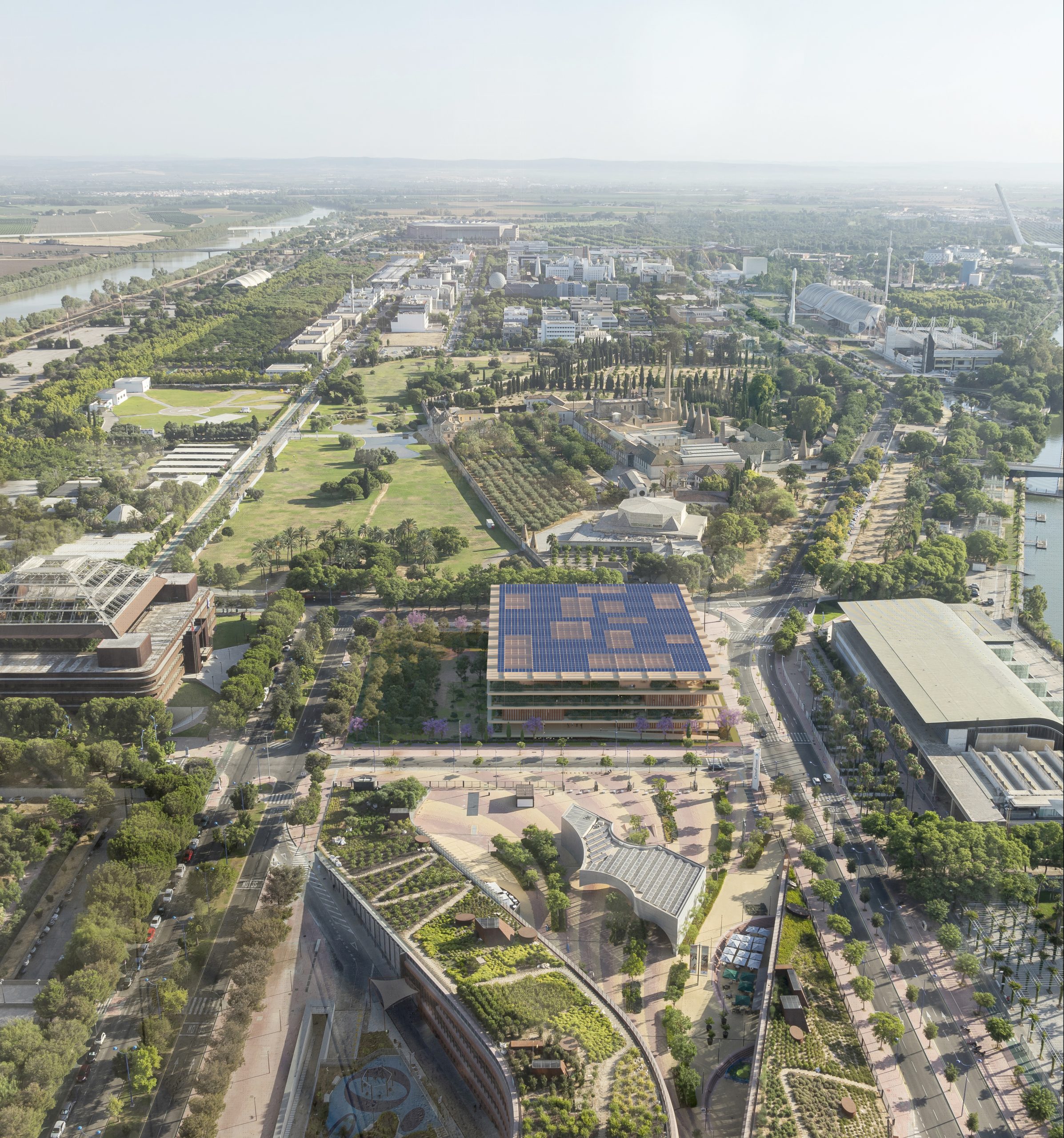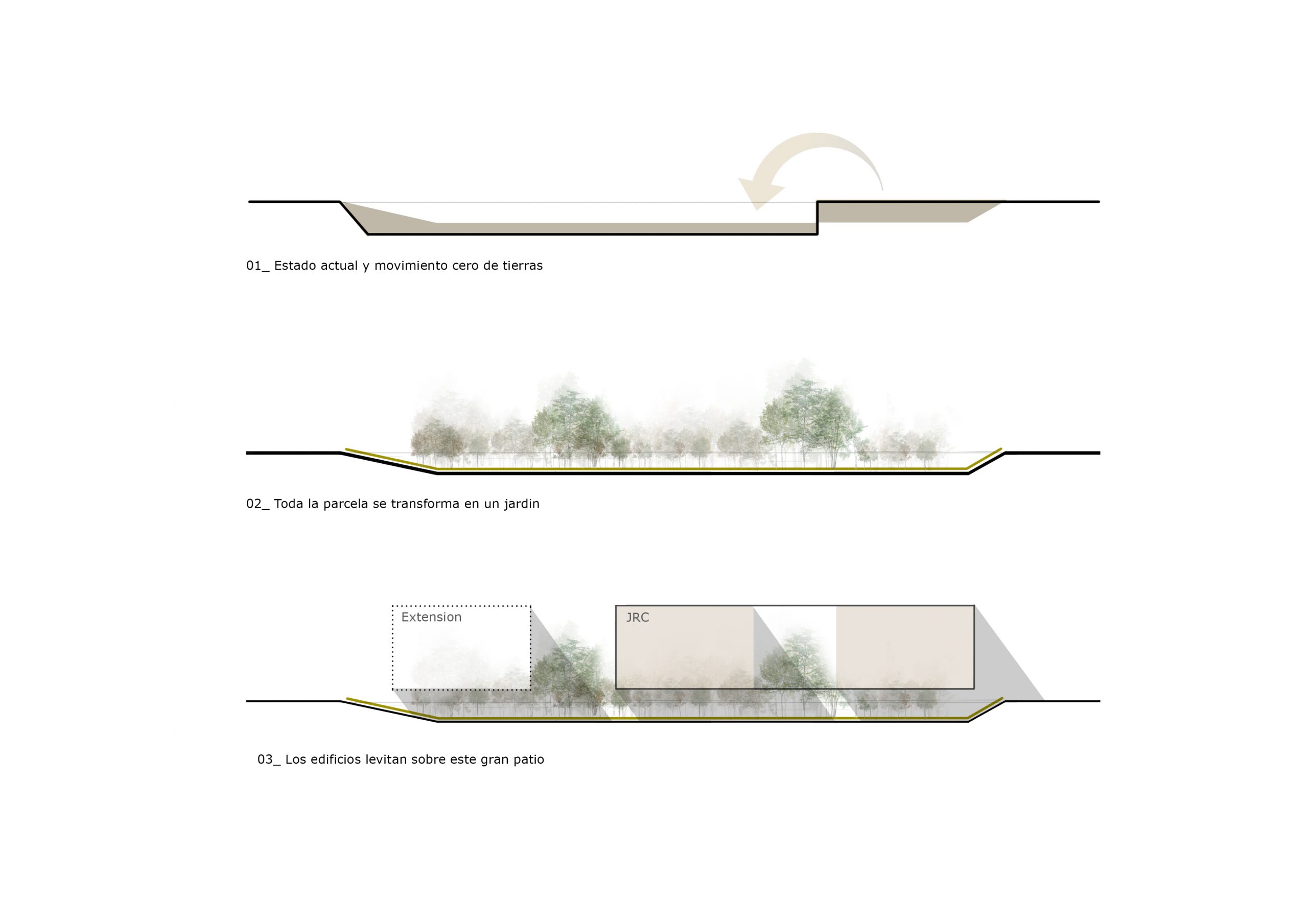 El proyecto de la sede del Joint Research Centre en la Isla de la Cartuja se plantea como una pieza que levita sobre un gran jardín. Retranqueos estratégicos amplían el espacio público y cosen los flujos entre el Monasterio de la Cartuja, la Torre Sevilla, el WTC y el parque Magallanes, mientras la orientación norte–sur aprovecha luz y vientos dominantes del Guadalquivir.