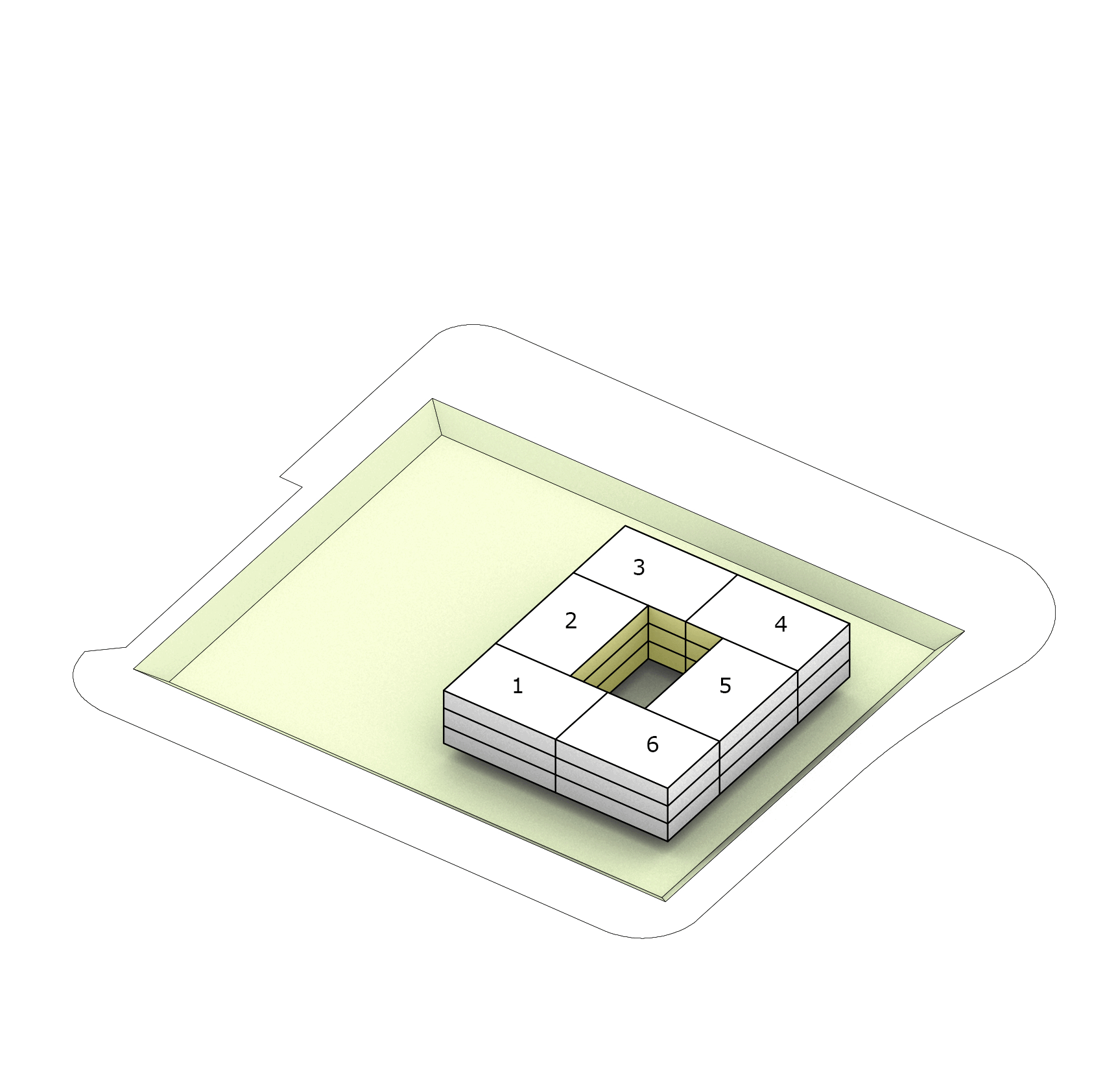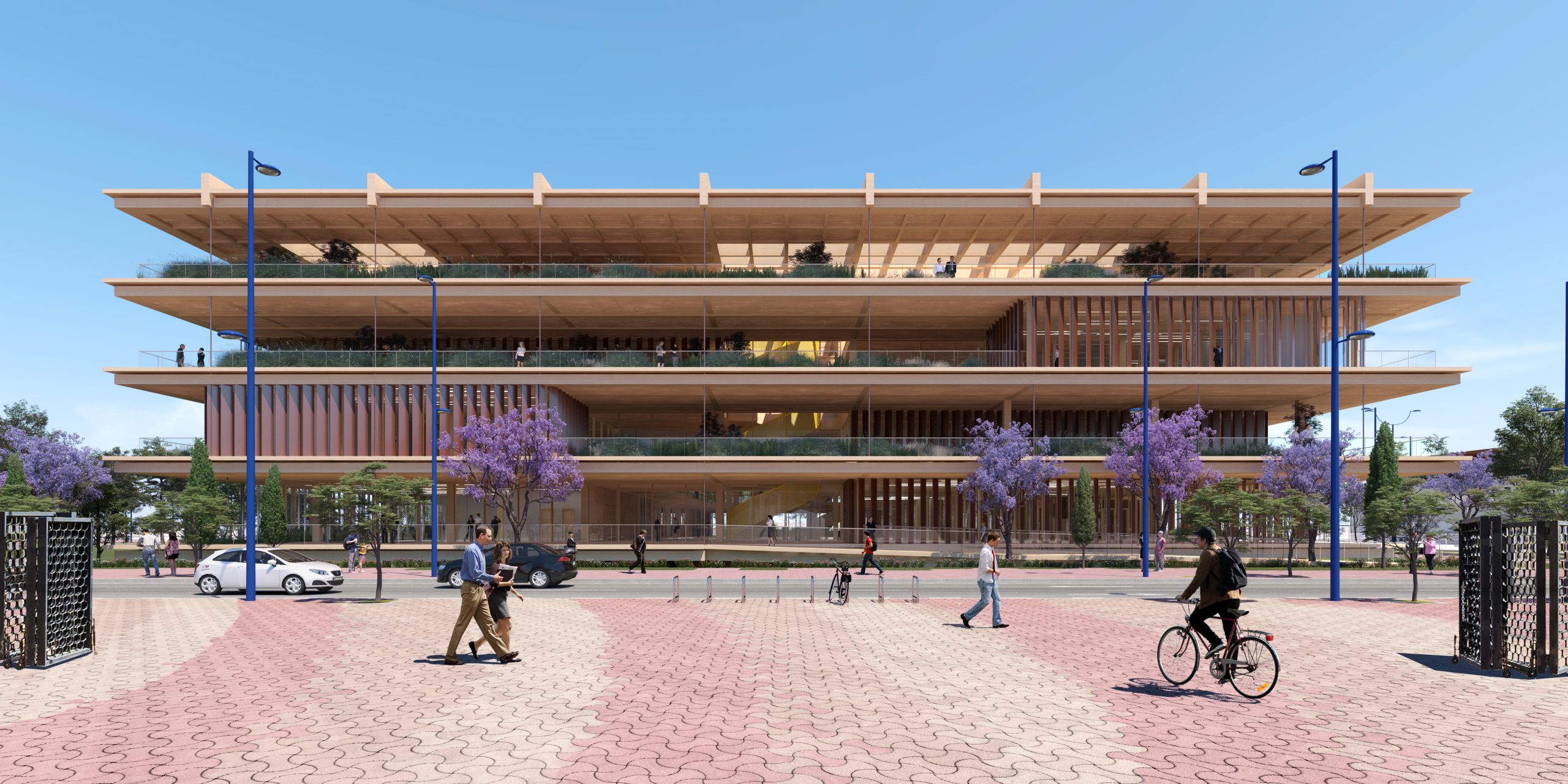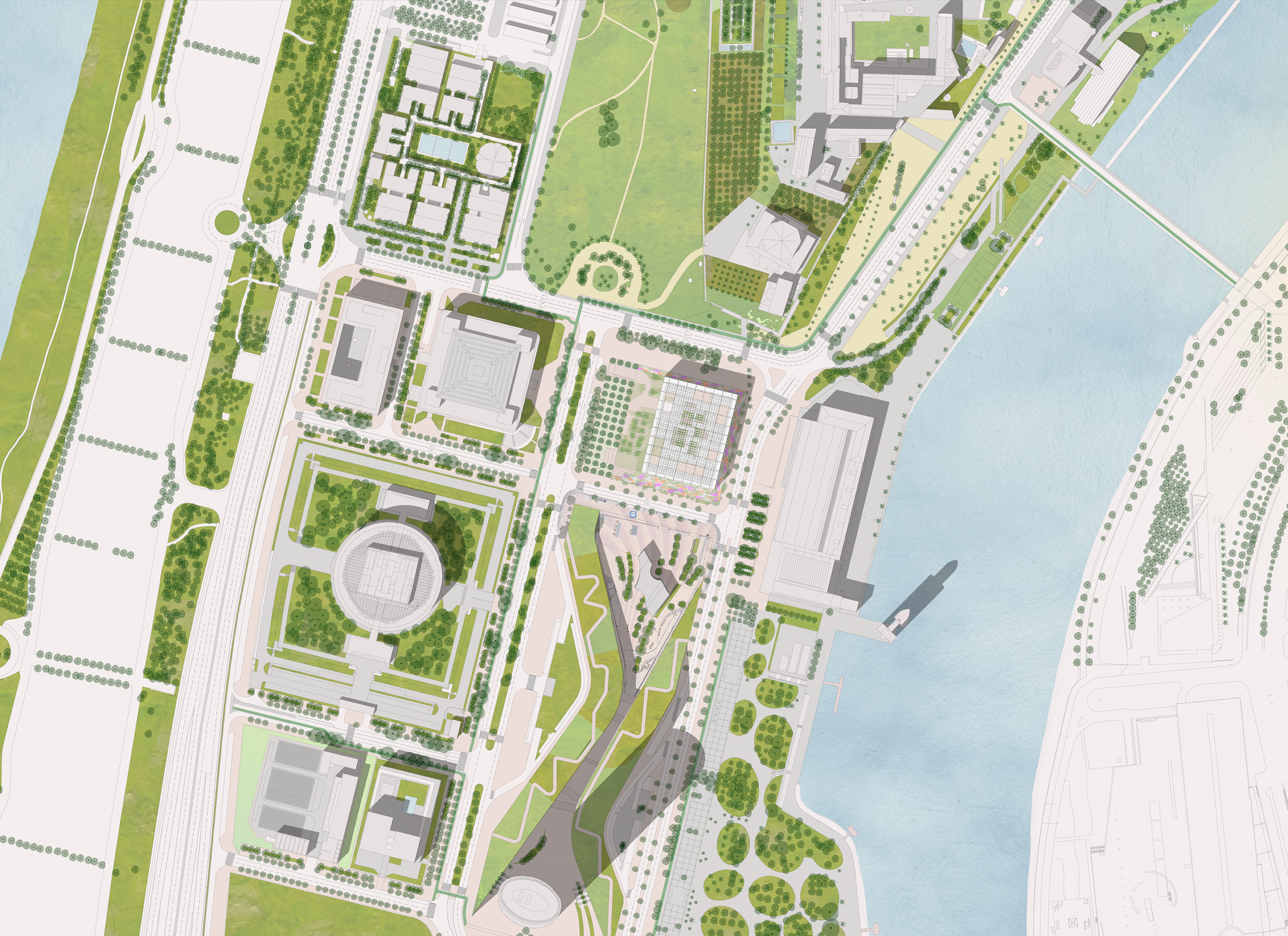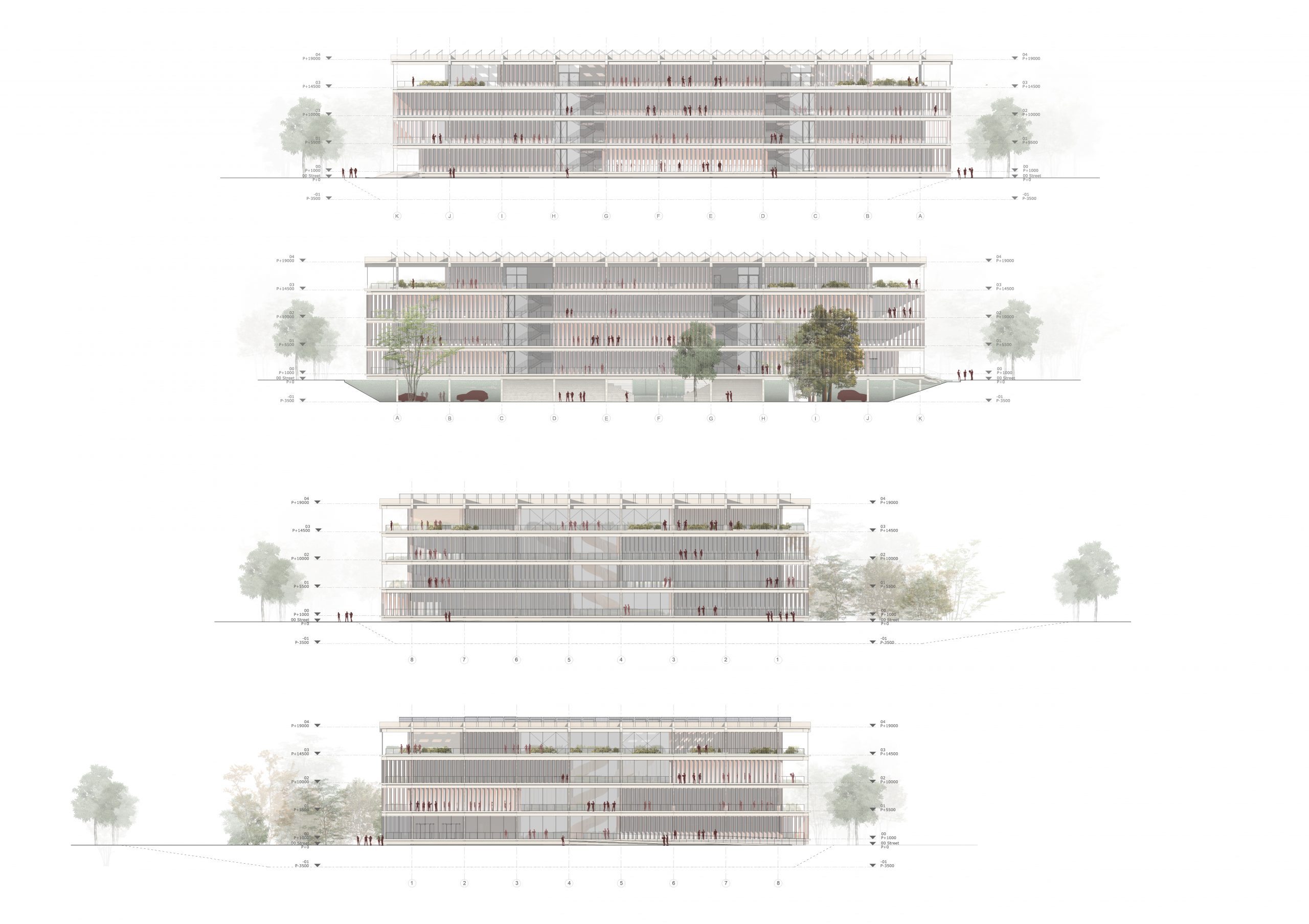 El proyecto de la sede del Joint Research Centre en la Isla de la Cartuja se plantea como una pieza que levita sobre un gran jardín. Retranqueos estratégicos amplían el espacio público y cosen los flujos entre el Monasterio de la Cartuja, la Torre Sevilla, el WTC y el parque Magallanes, mientras la orientación norte–sur aprovecha luz y vientos dominantes del Guadalquivir.