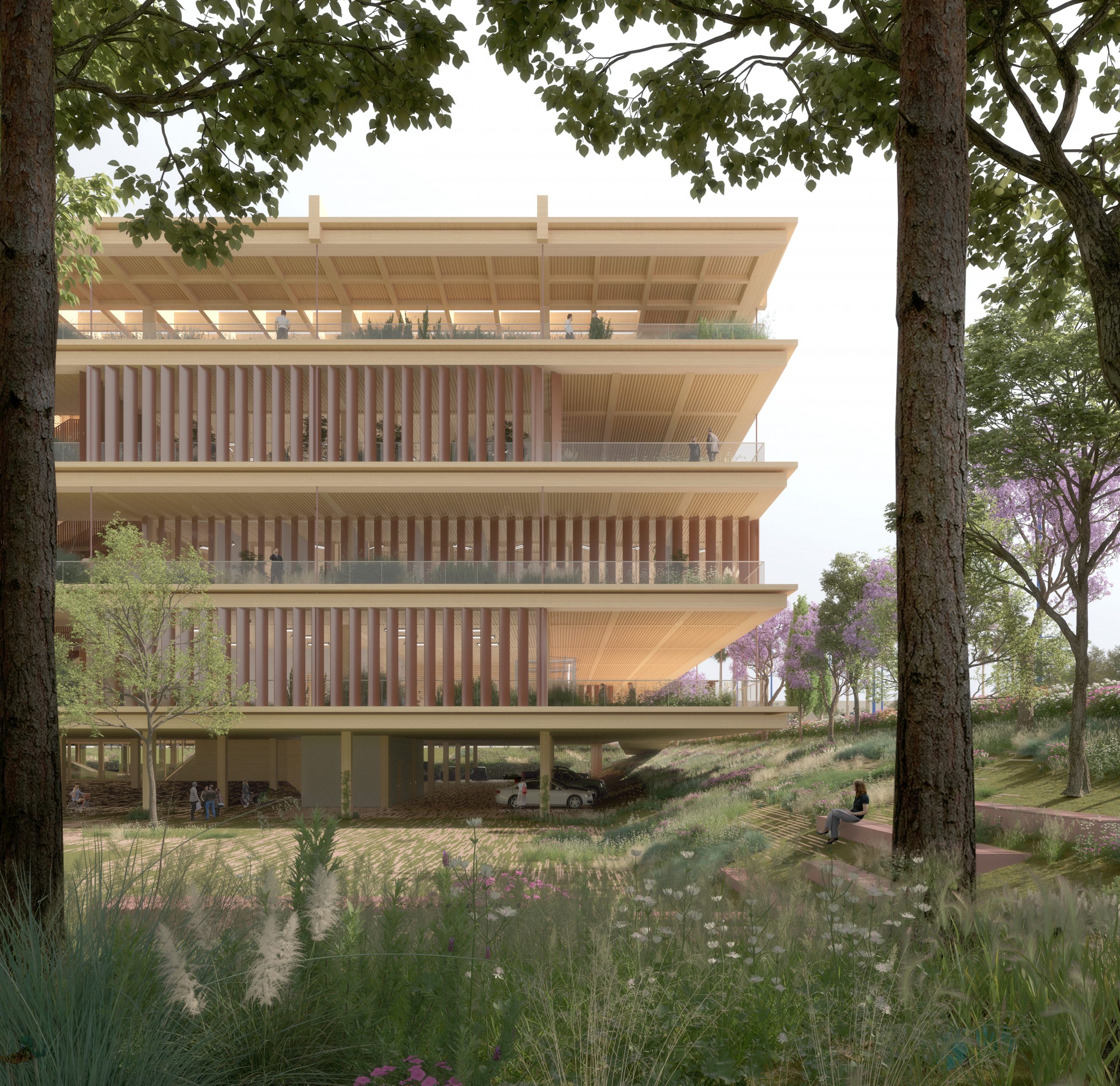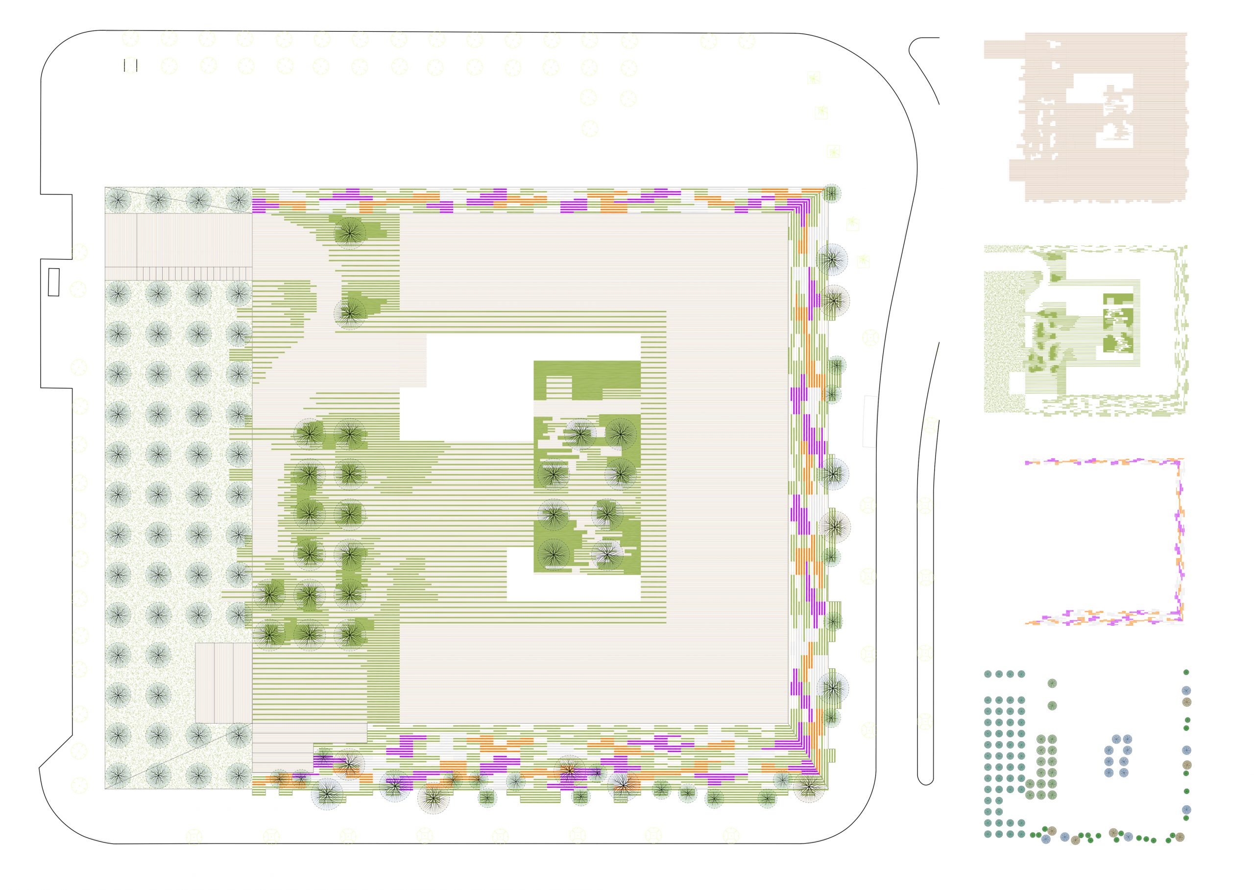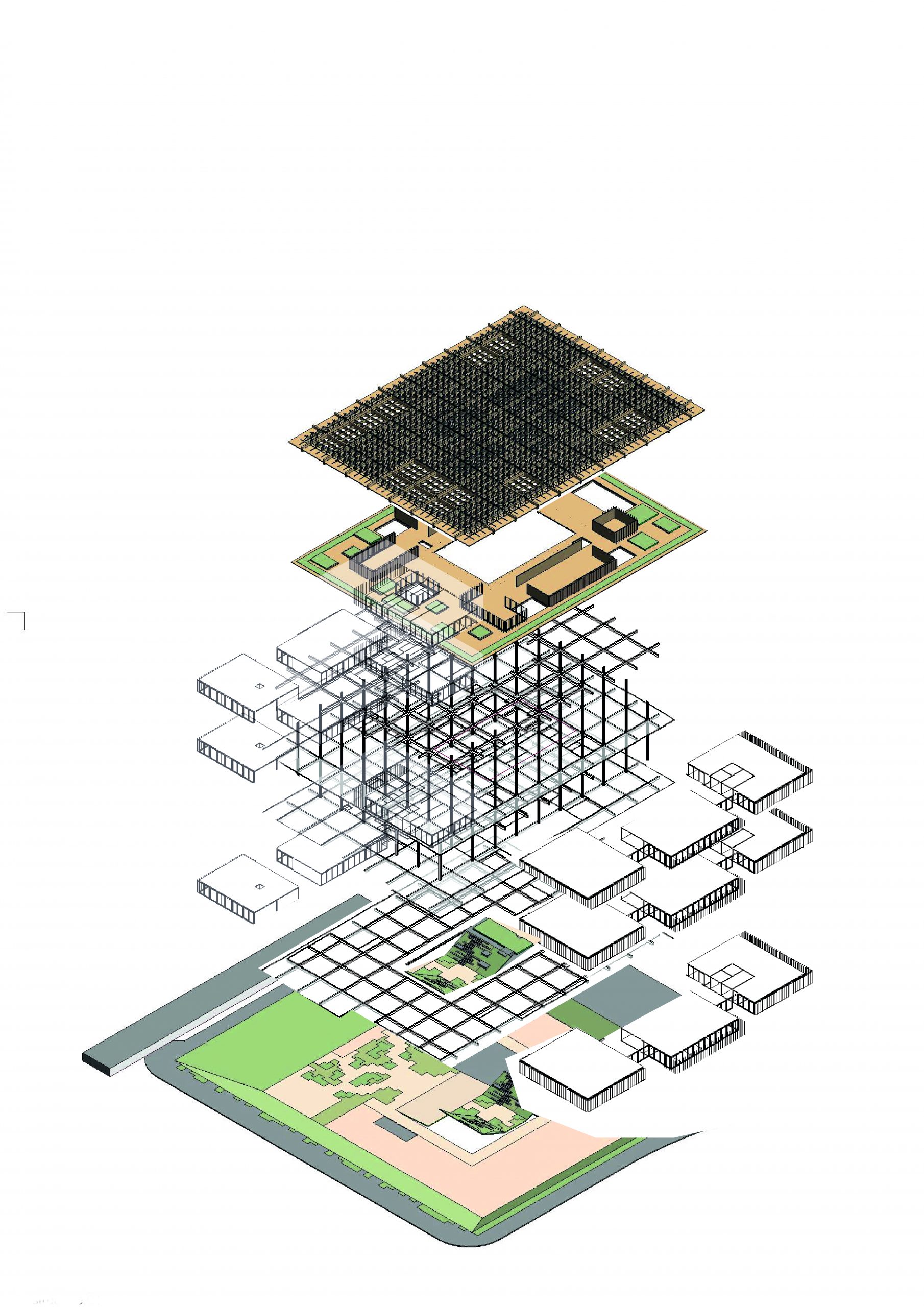 La estrategia bioclimática “box-in-box” reduce al mínimo los espacios climatizados y crea áreas intermedias ventiladas de forma natural. Ventilación cruzada, inercia térmica del forjado y cubiertas verdes de bajo mantenimiento conducen a un objetivo NZEB. El paisaje se modela a –3,5 m con una malla cerámica que estabiliza pendientes y define recorridos, e integra un jardín productivo de especies autóctonas que compensa la huella de carbono.