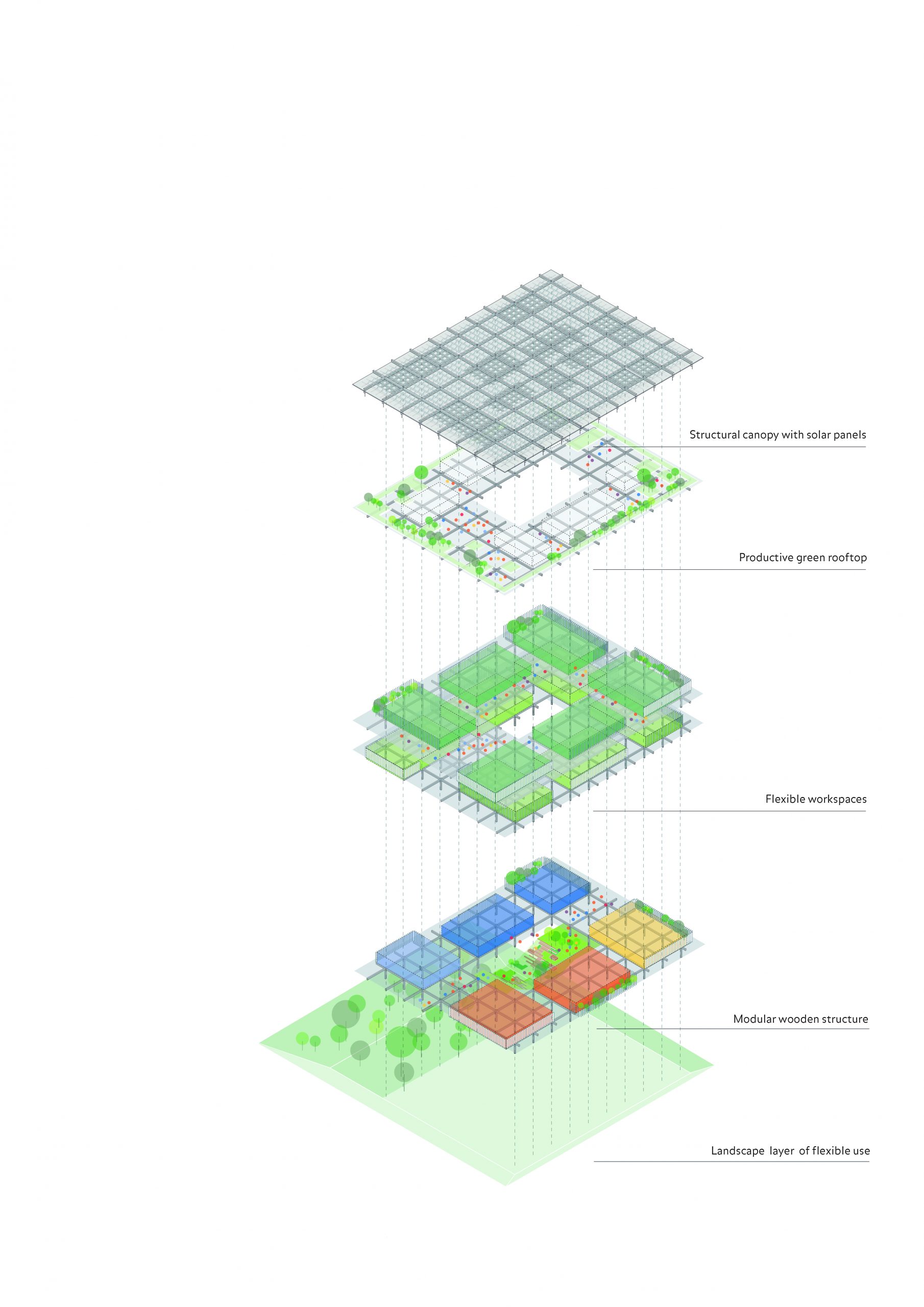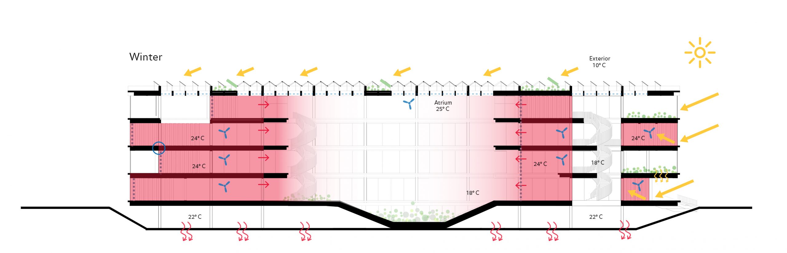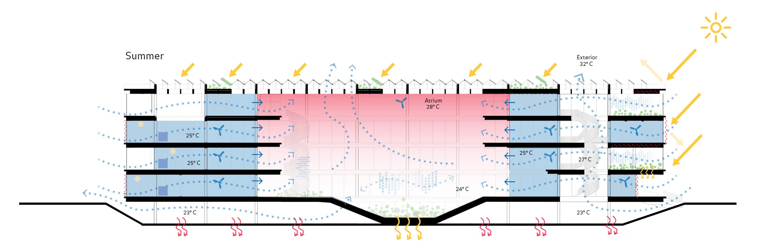 El edificio se organiza en torno a un gran atrio abierto al jardín inferior. La planta baja reúne los usos comunes y las dos plantas superiores alojan doce clusters de trabajo interconectados. Una gran marquesina en cubierta protege del sol y soporta 2.500 m² de paneles fotovoltaicos, aportando autosuficiencia energética y regulando iluminación y ventilación del corazón del edificio.