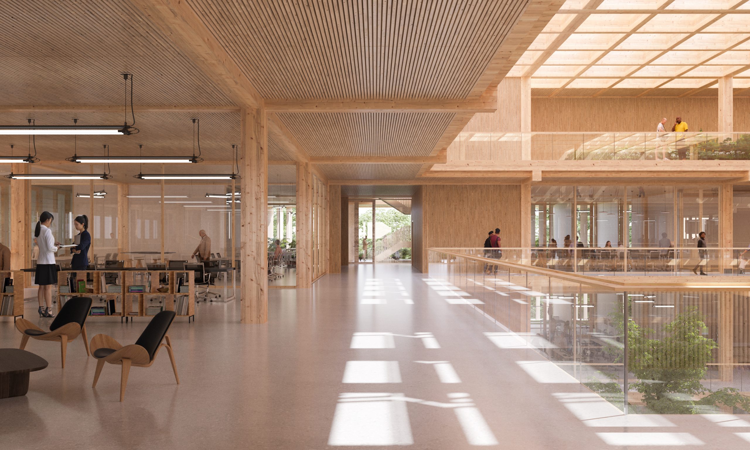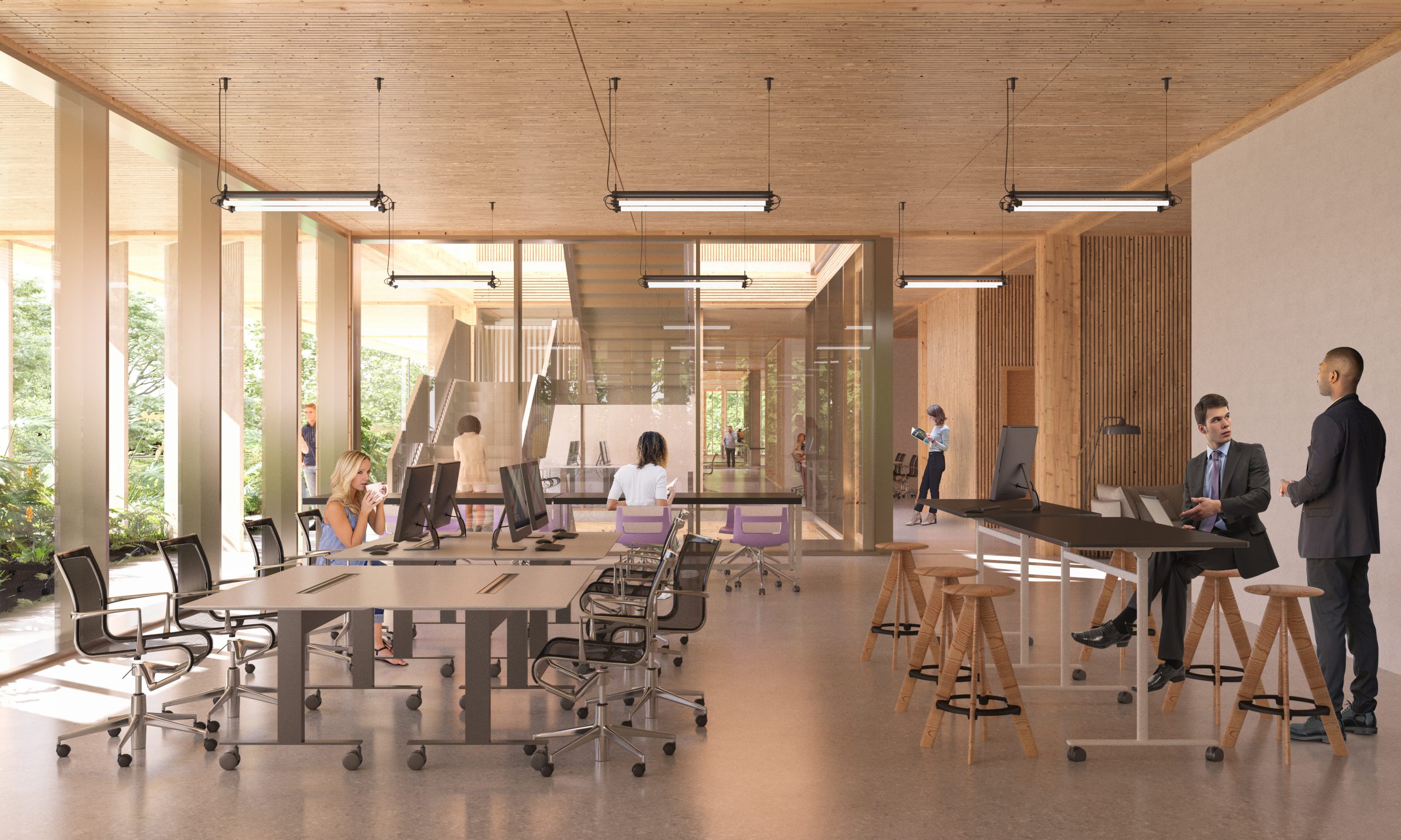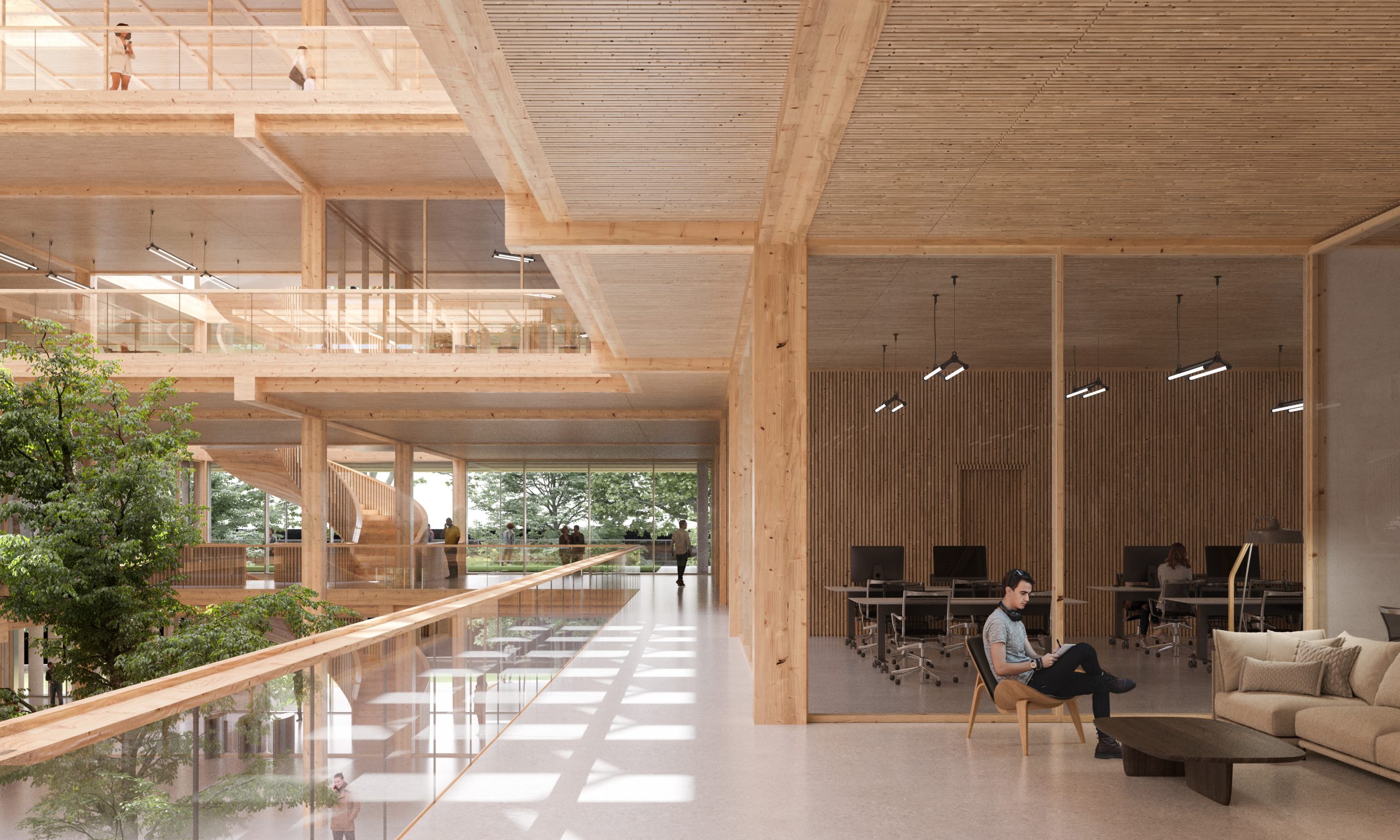 El edificio se organiza en torno a un gran atrio abierto al jardín inferior. La planta baja reúne los usos comunes y las dos plantas superiores alojan doce clusters de trabajo interconectados. Una gran marquesina en cubierta protege del sol y soporta 2.500 m² de paneles fotovoltaicos, aportando autosuficiencia energética y regulando iluminación y ventilación del corazón del edificio.