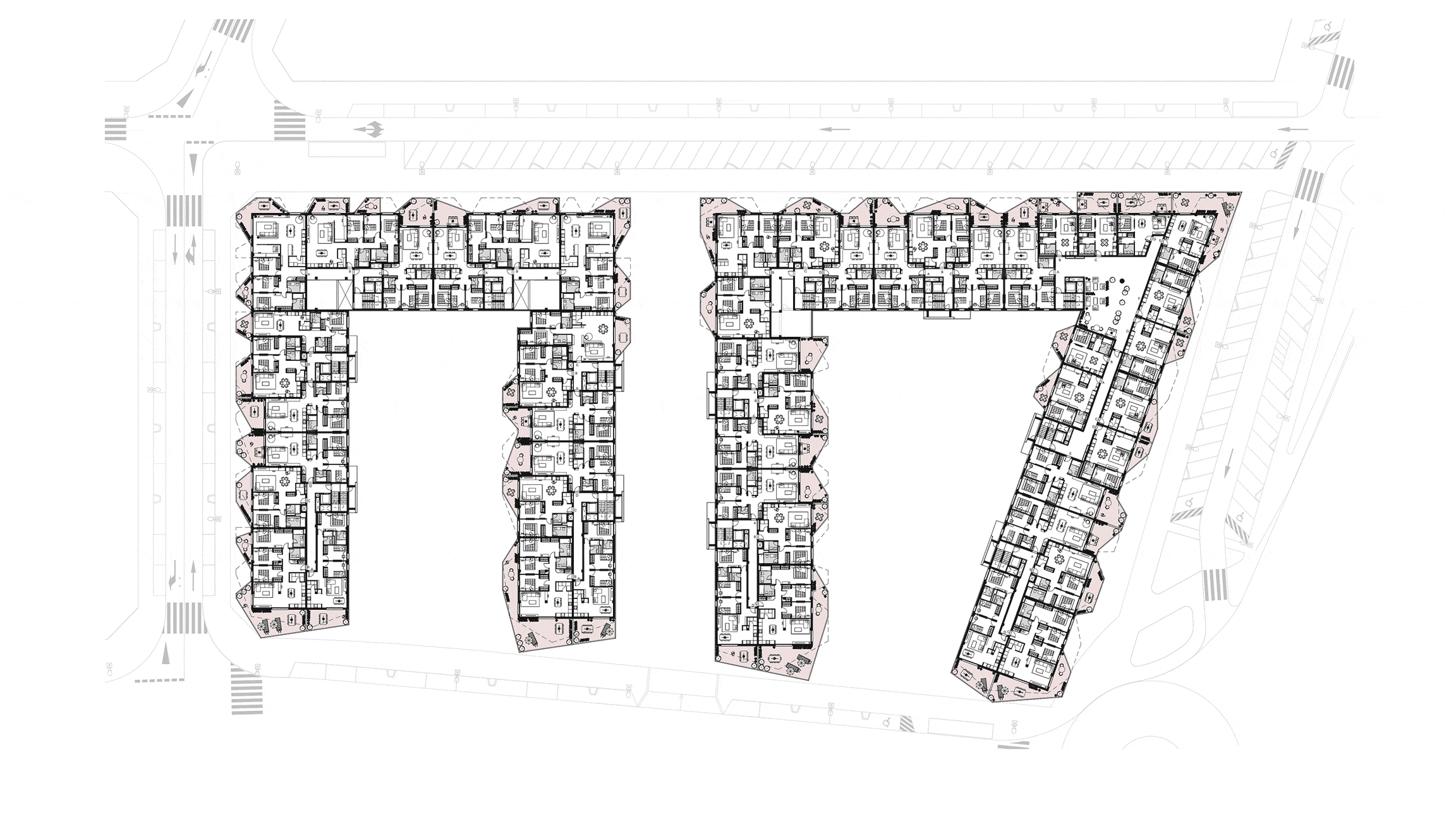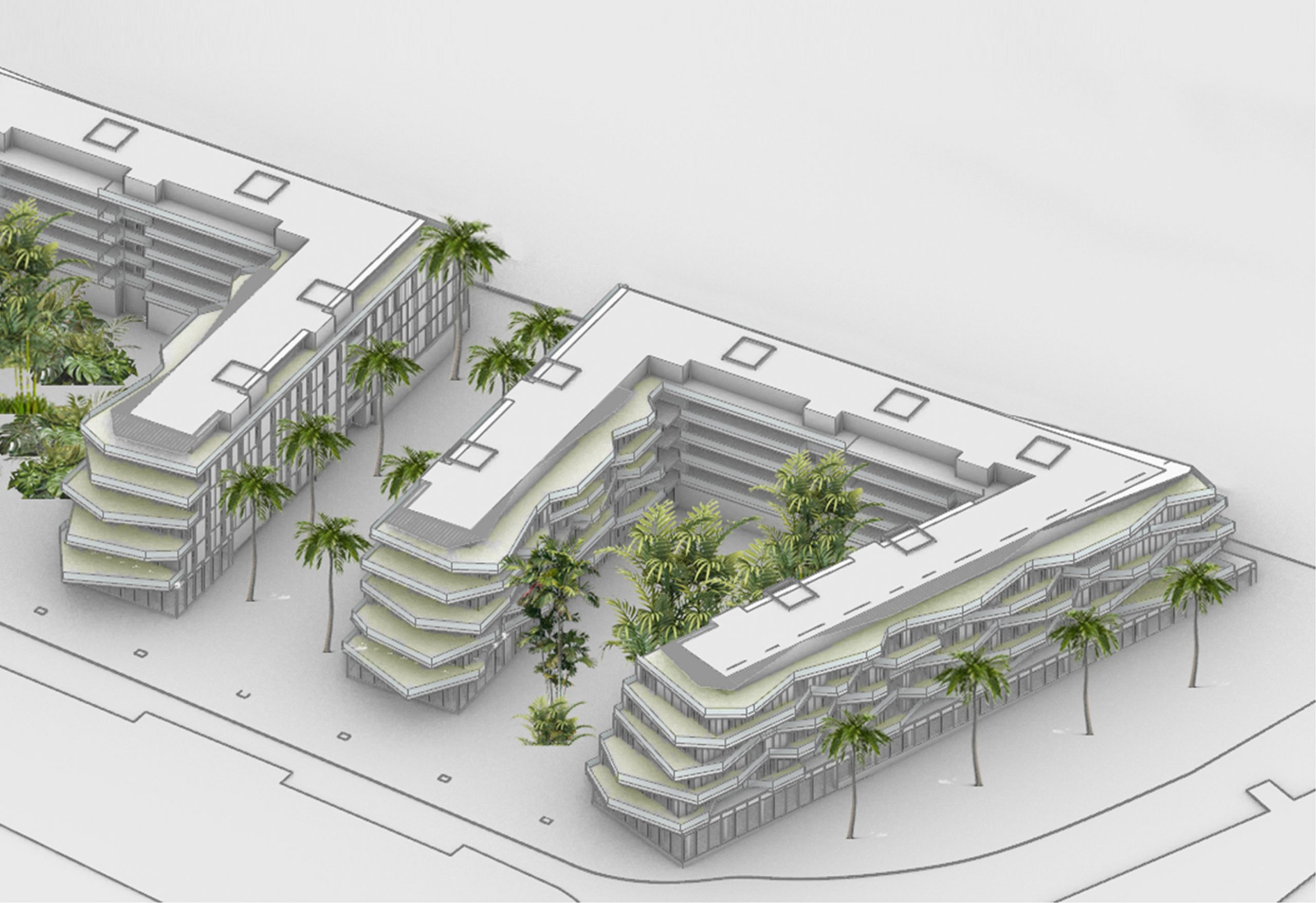 La propuesta se desarrolla desde una lógica de apertura, tanto física como espacial. Dos bloques residenciales se disponen en forma de U, abiertos al sur, capturando luz, vistas y brisa marina. Esta geometría no solo estructura el proyecto, sino que lo enraíza en su contexto: frente a la rigidez de la manzana cerrada, se opta por una forma abierta y permeable, que dignifica el vacío central como lugar de relación, clima y vida comunitaria.