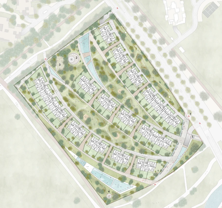 El proyecto se desmarca del modelo tradicional de bloques residenciales y propone una nueva forma de habitar: una colección de villas de baja densidad, dispersas en un entorno natural continuo. La arquitectura ya no se impone al paisaje, sino que se adapta a él, fragmentándose para generar una escala más amable, humana y conectada.