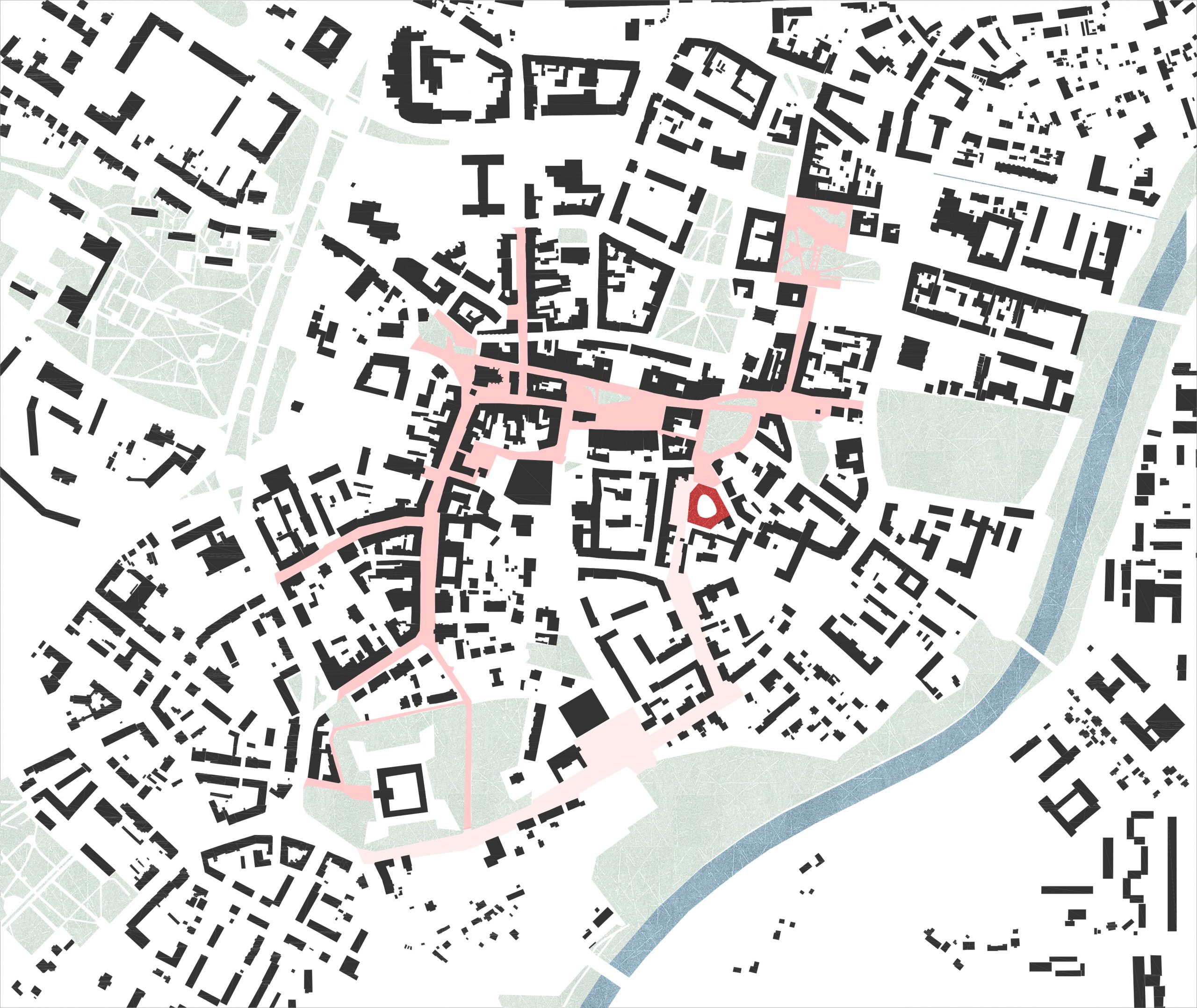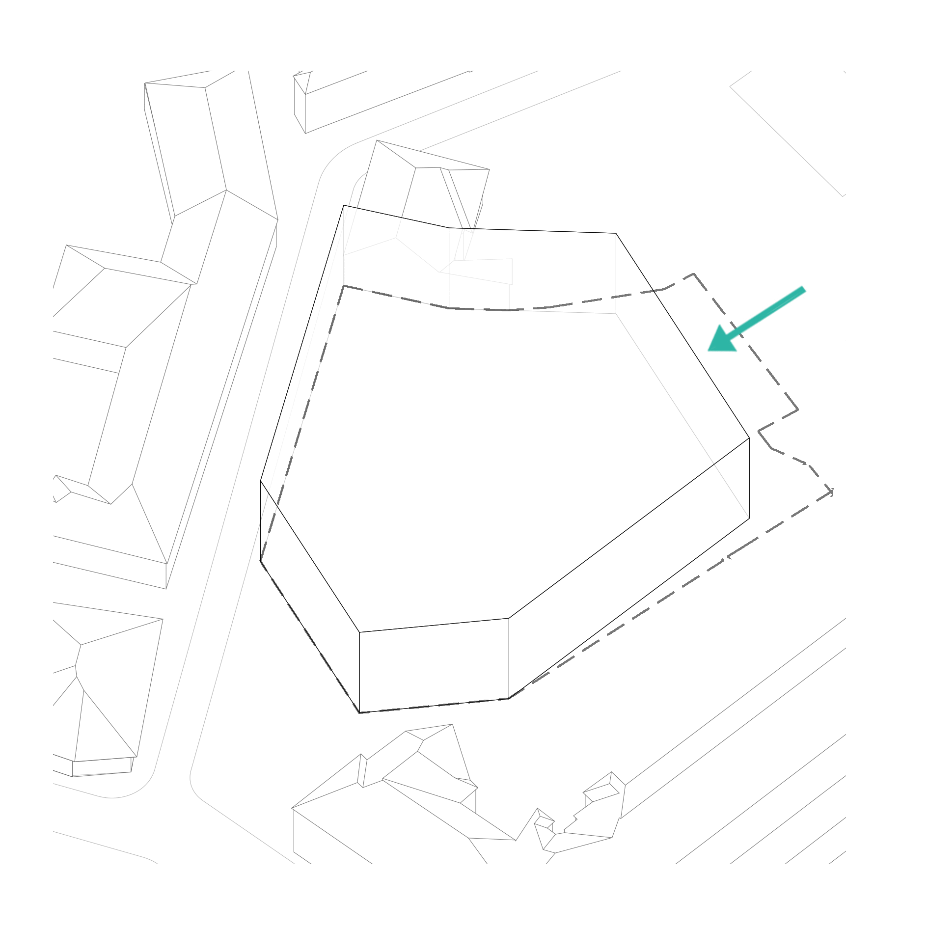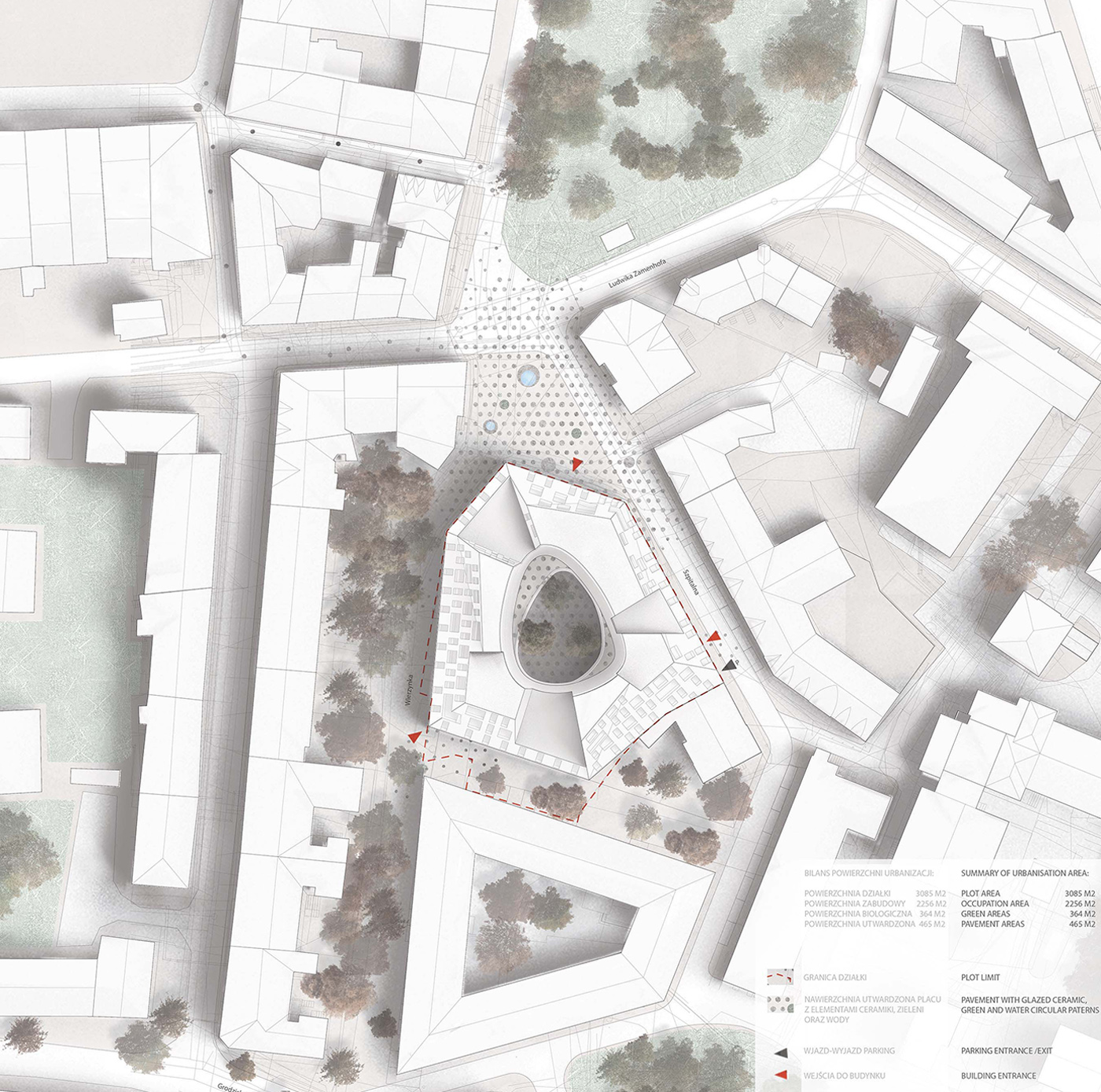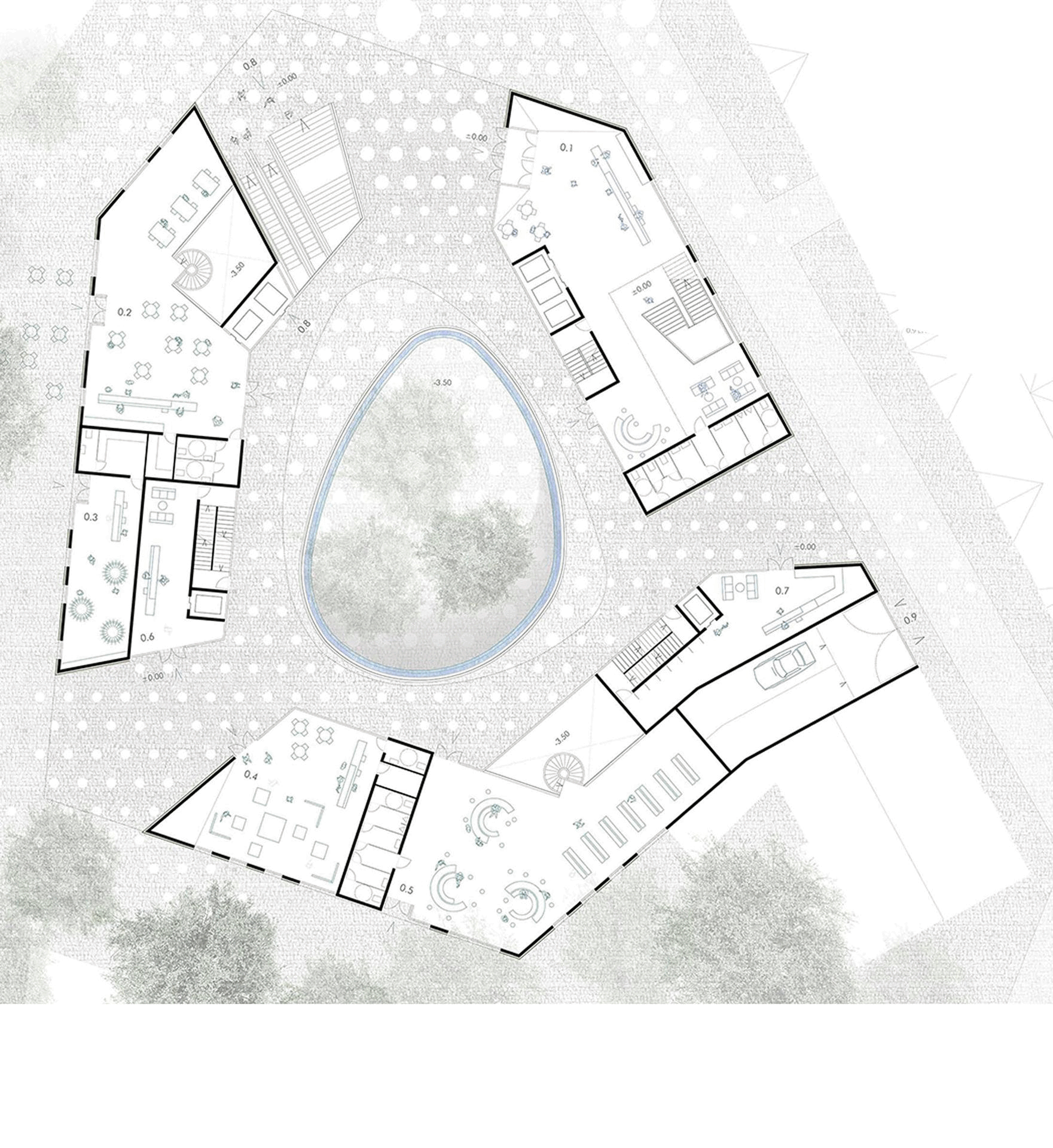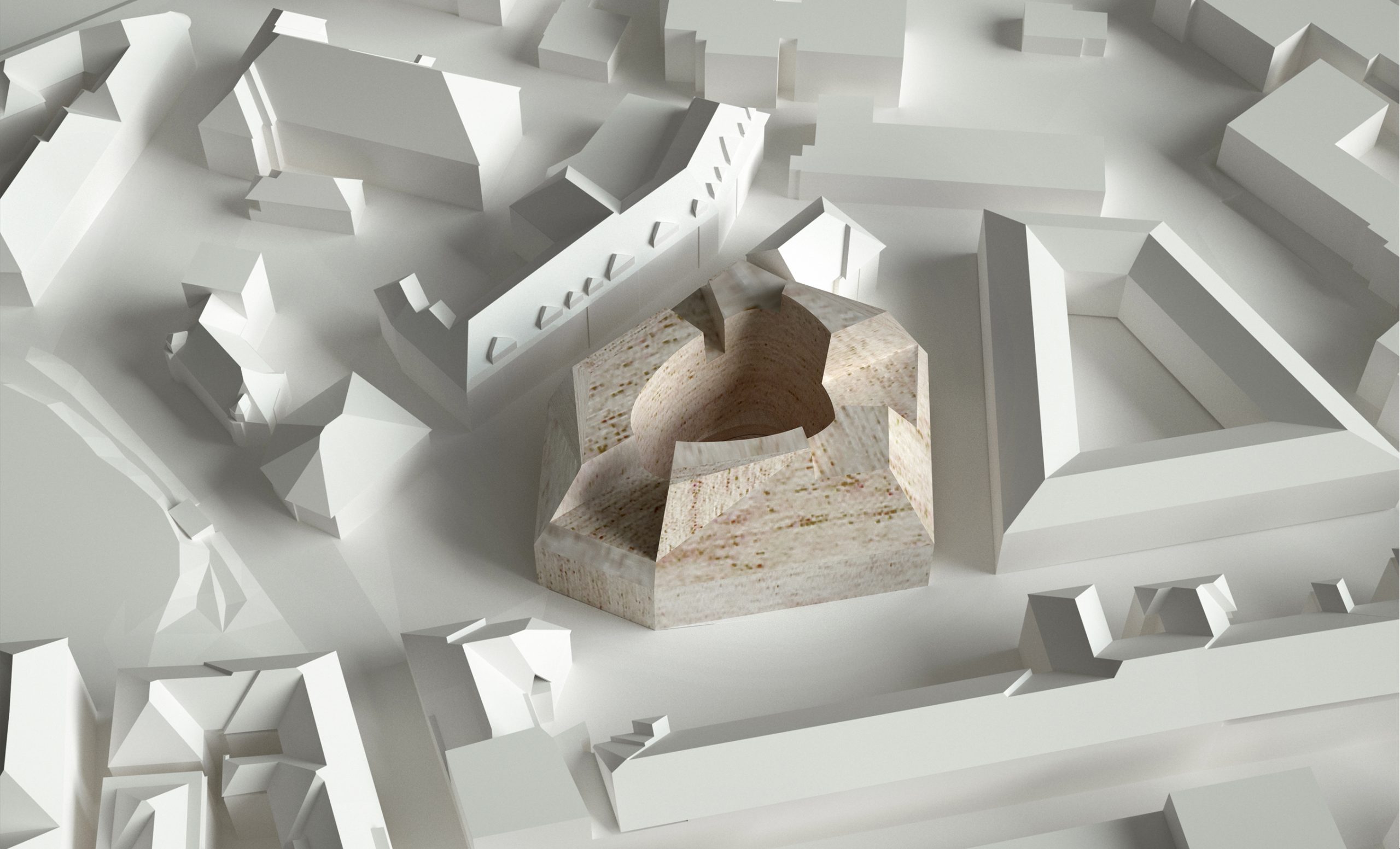 La composición compacta del volumen exterior se contrapone a la suavidad y fluidez del gran patio interior. Inspirado en el torno del alfarero, este vacío cónico y redondeado se convierte en un núcleo de luz, ventilación y encuentro, conectando de manera directa con el Mercado Viejo y la Plaza del Mercado a través de un acceso abierto y generoso.