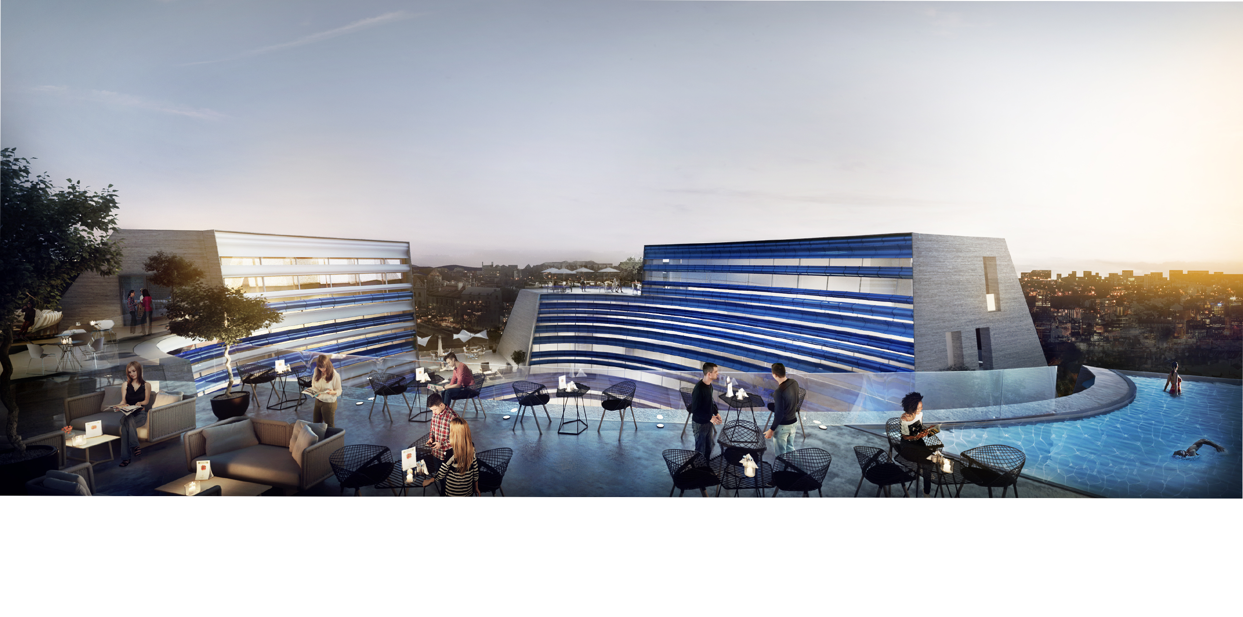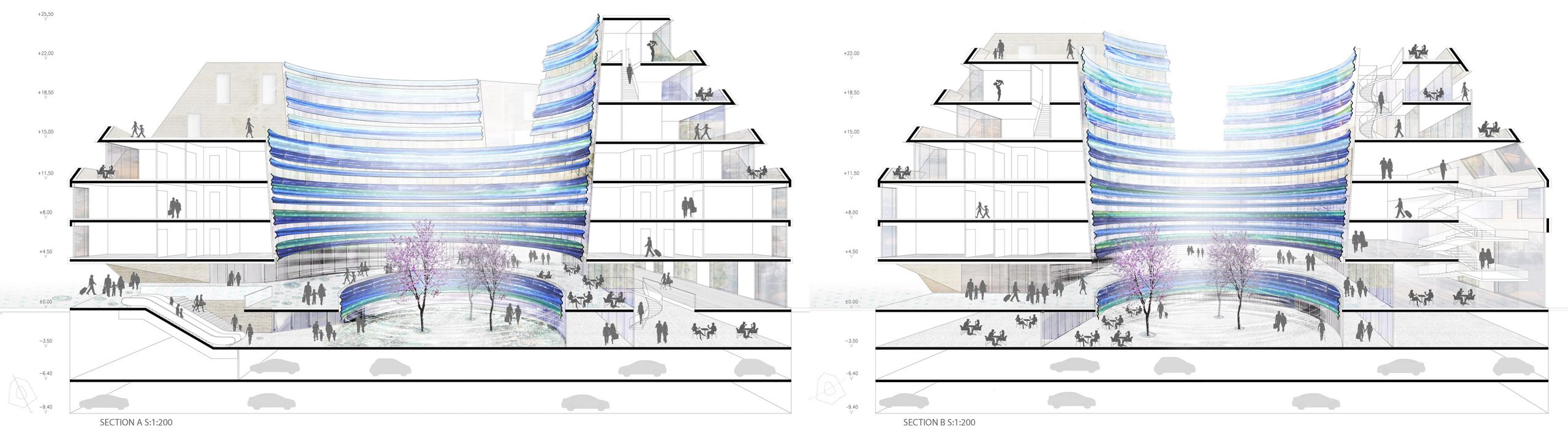 El proyecto esculpe la masa edificada como si de arcilla se tratara, generando un interior sorprendente que convierte al edificio en un nuevo referente urbano y cultural. El programa combina usos comerciales, hoteleros y residenciales, rematados por un club social con restaurante y terrazas panorámicas.