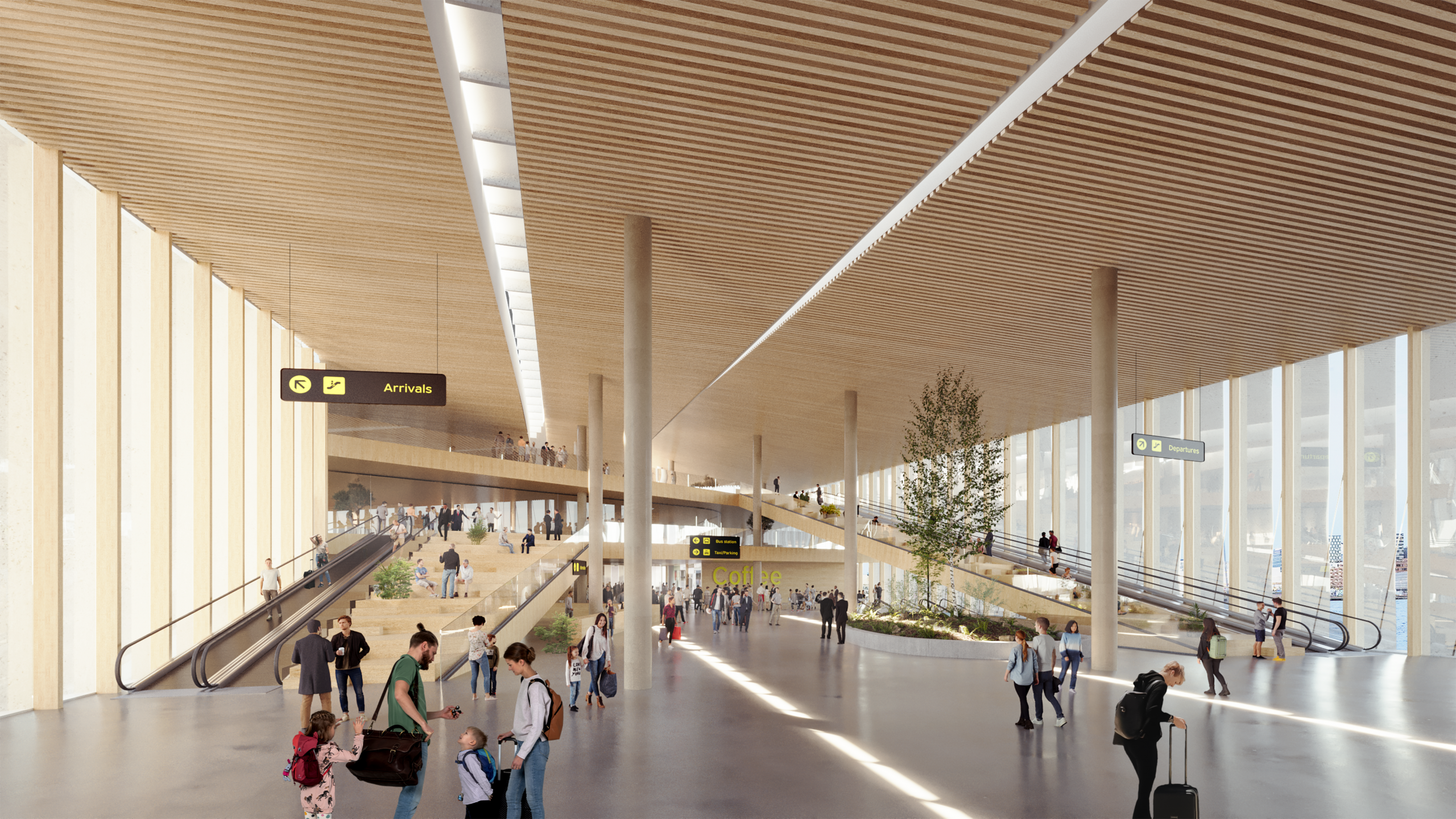 La idea arquitectónica parte de un reto: conciliar la libertad y la amplitud perceptible de un gran espacio público con la precisión y el control que exige un terminal internacional. El edificio principal se concibe como un volumen ligero y transparente, con un acceso porticado rotundo y atemporal que da paso a espacios interiores claros, cómodos y seguros. El diseño se orienta a guiar de forma intuitiva el movimiento de los viajeros, favoreciendo una experiencia lógica y serena desde el embarque hasta la llegada.