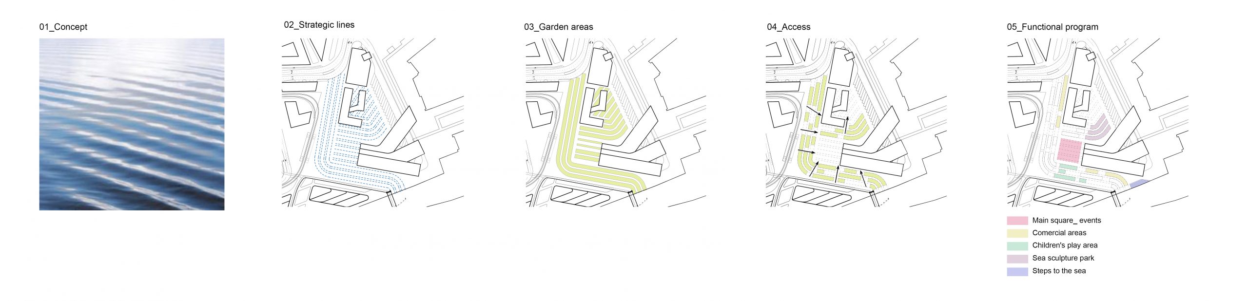 El planteamiento urbano tiene en cuenta la llegada del tranvía, la conexión con la estación de ferrocarril y con la futura Rail Baltic, organizando una red de accesos clara, segura y libre de conflictos entre peatones, ciclistas y vehículos. El estacionamiento de turibuses, taxis y automóviles se integra bajo rasante o en volúmenes específicos, liberando la superficie para el uso ciudadano y garantizando una accesibilidad cómoda para todos los usuarios, incluidas personas con movilidad reducida.