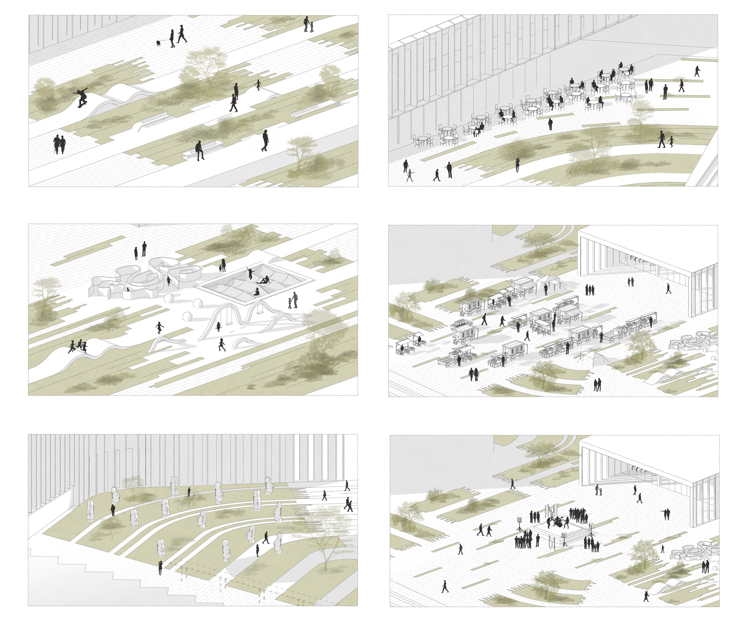 La arquitectura del paisaje se convierte en parte esencial del proyecto. El espacio público se concibe como flexible, capaz de acoger tanto la vida cotidiana como eventos y actividades estacionales. Zonas de juego, pérgolas con vegetación, terrazas junto al canal y una cuidada estrategia de arbolado enriquecen la experiencia del paseo y abren la ciudad hacia el mar.