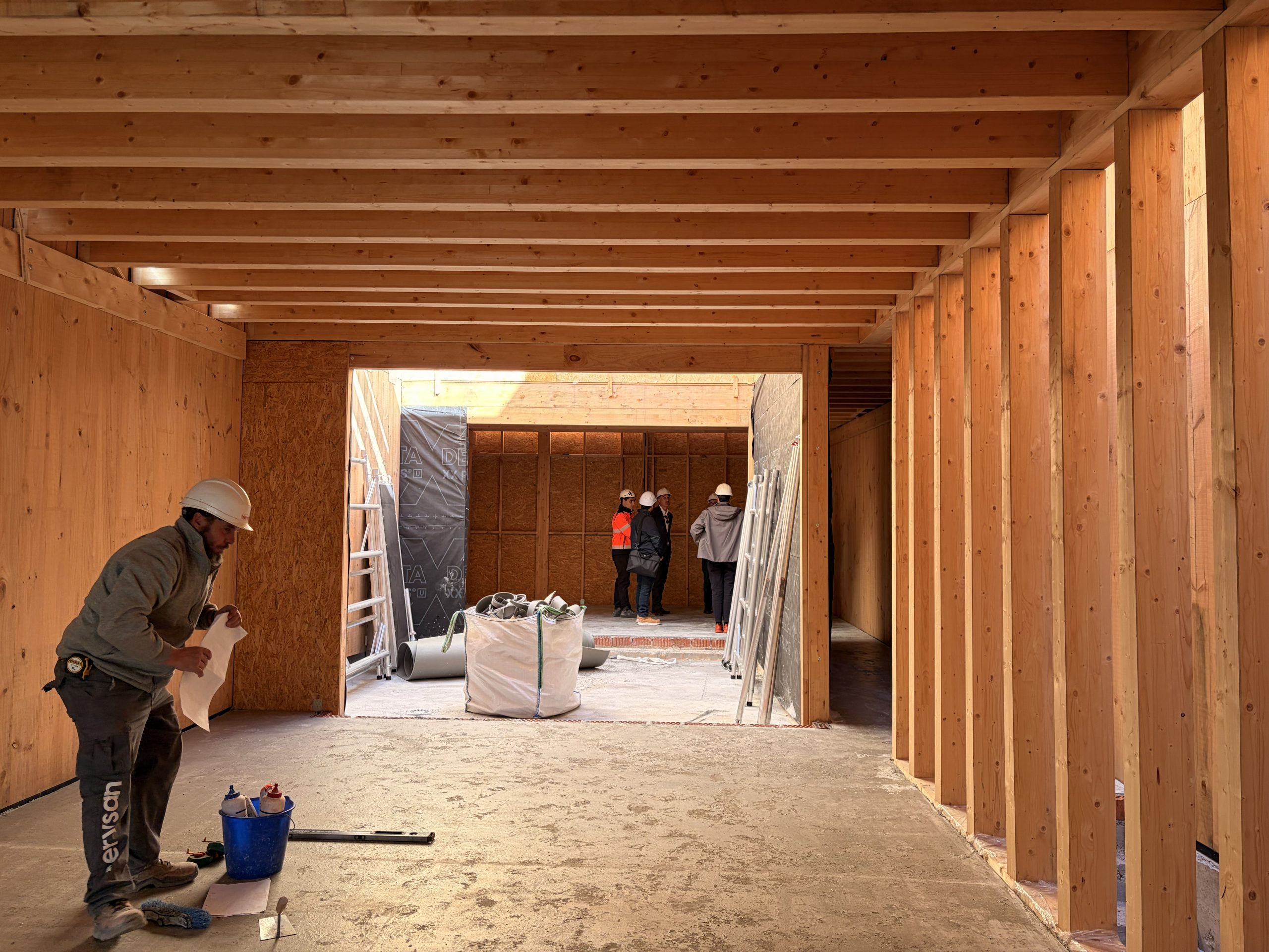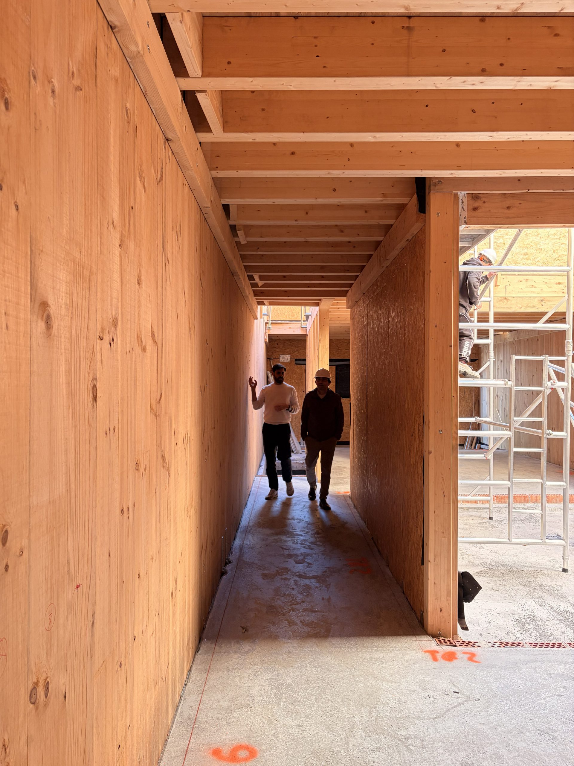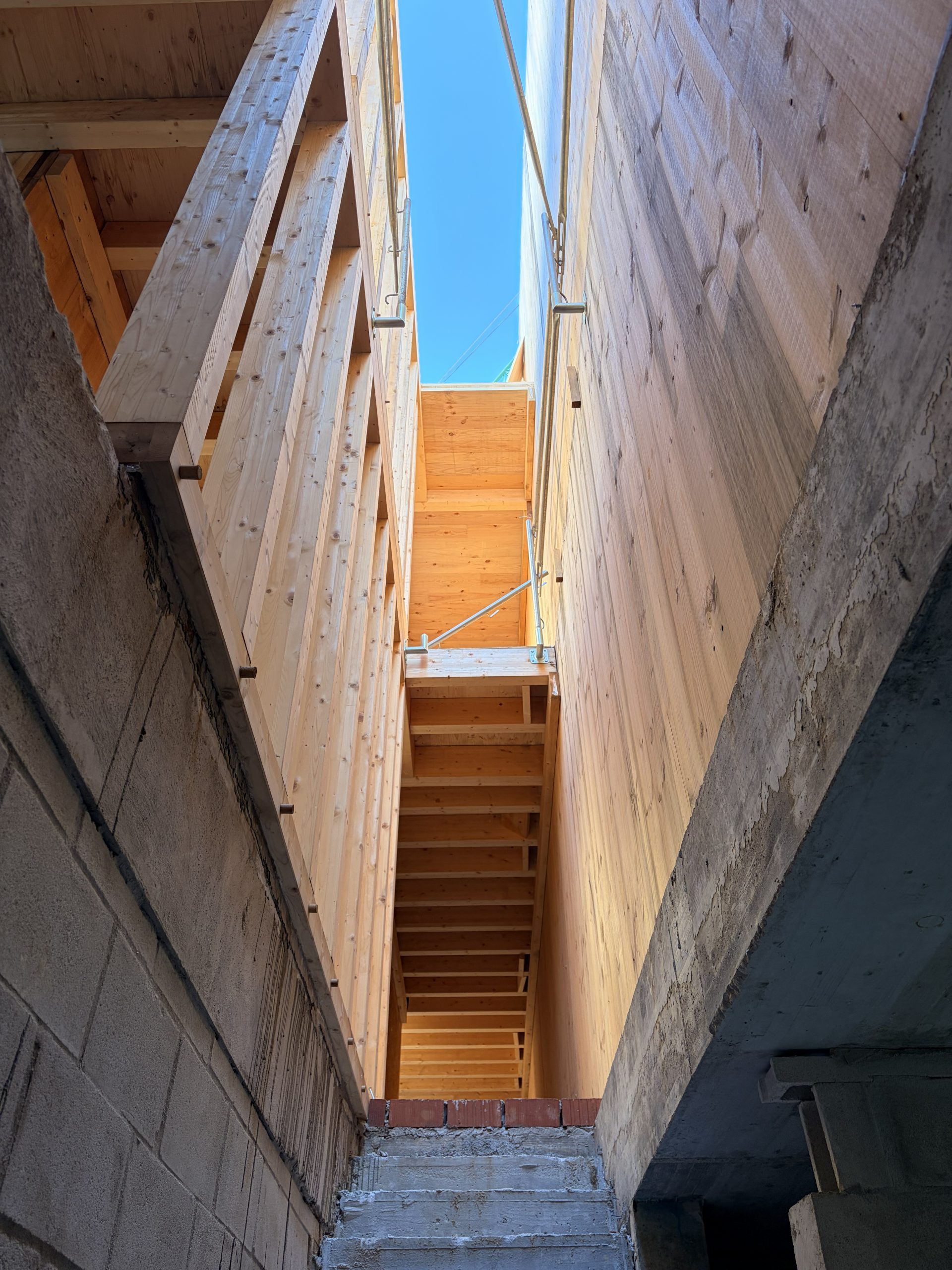 Cada vivienda se vuelca hacia su interior mediante un patio central cubierto por una claraboya, que se convierte en un espacio de uso y disfrute durante gran parte del año. Esta configuración garantiza iluminación natural, ventilación cruzada y privacidad, mientras que las estancias principales —salón y cocina-comedor— se abren completamente a este vacío mediante carpinterías plegables, diluyendo el límite entre interior y exterior.