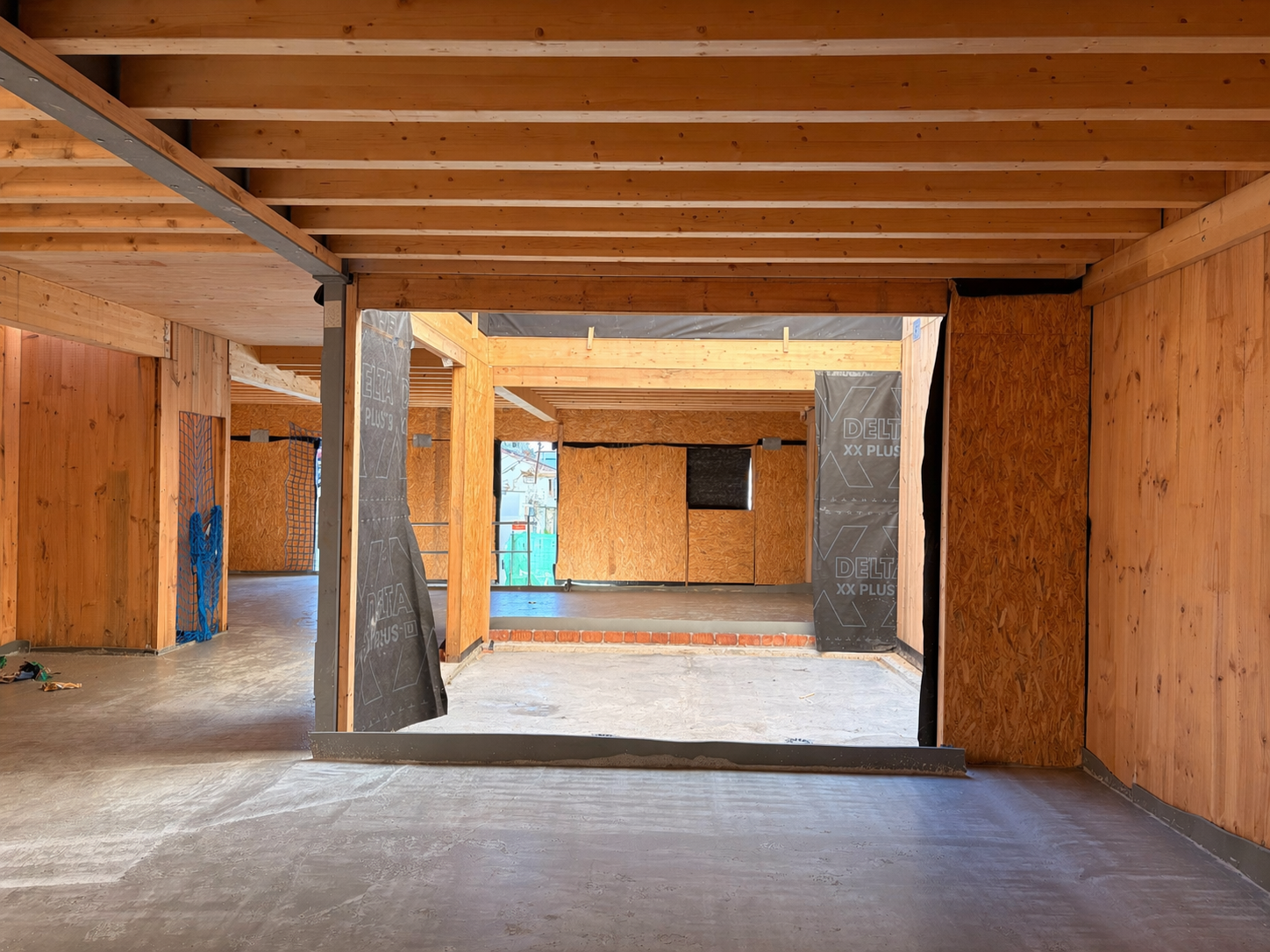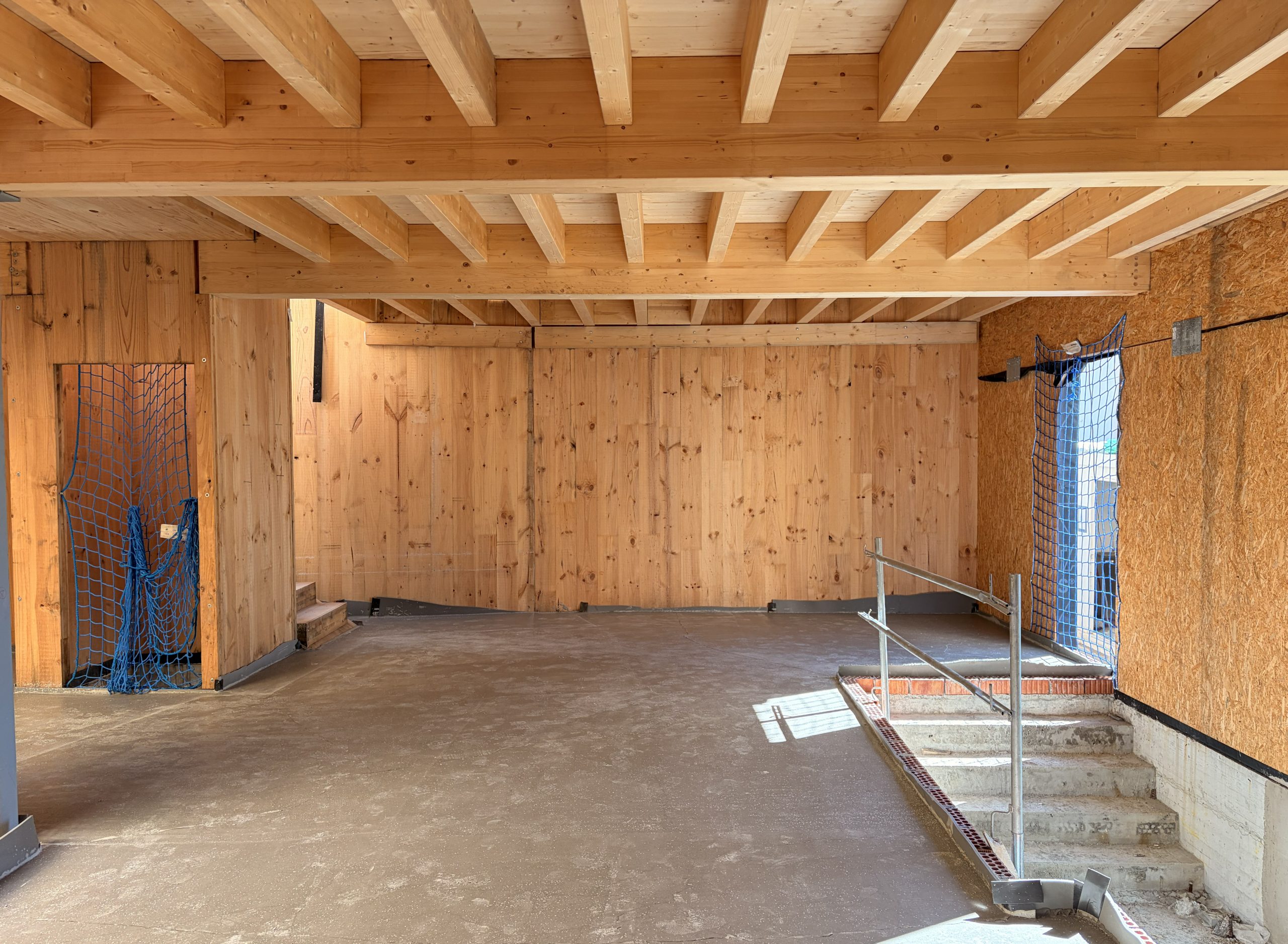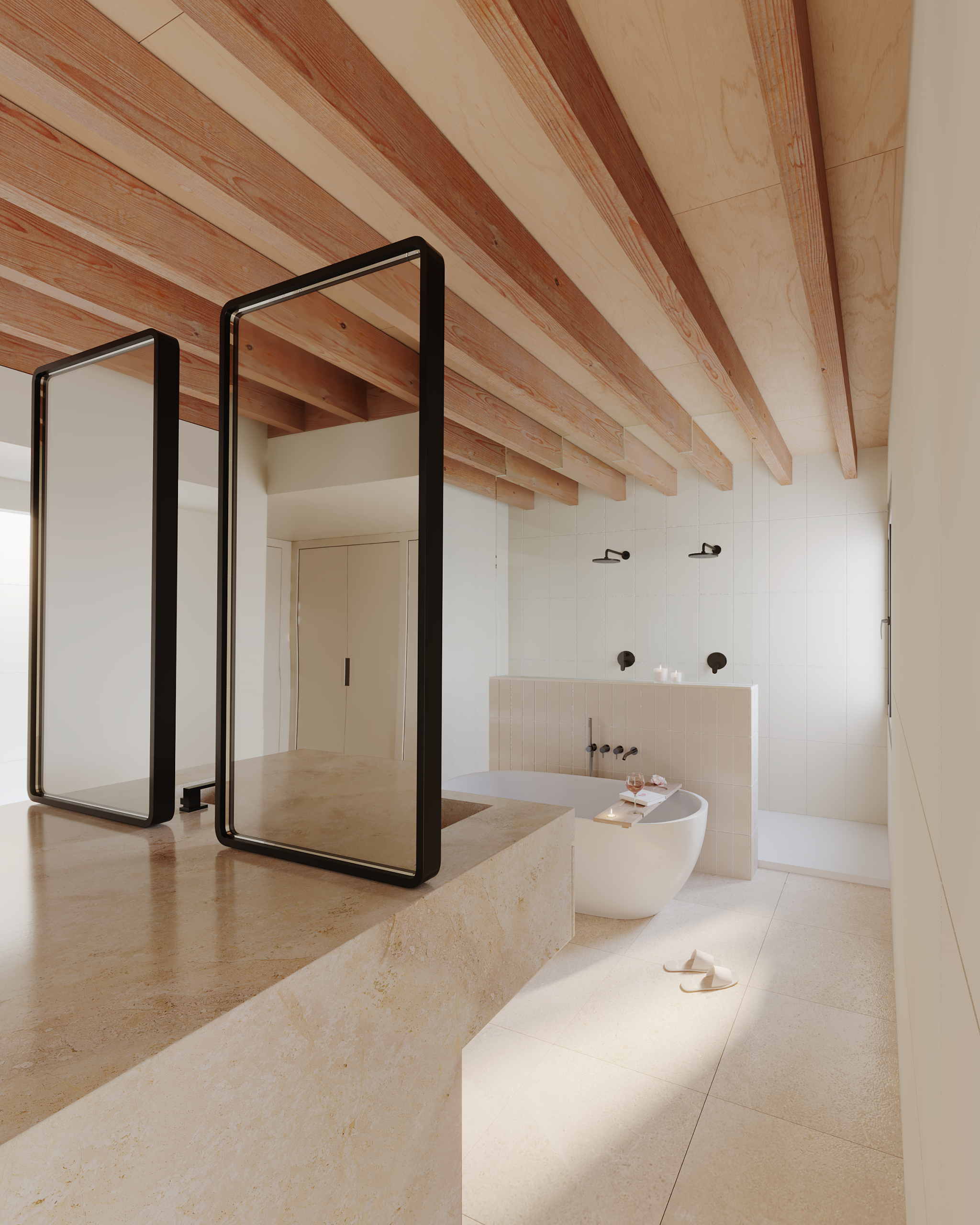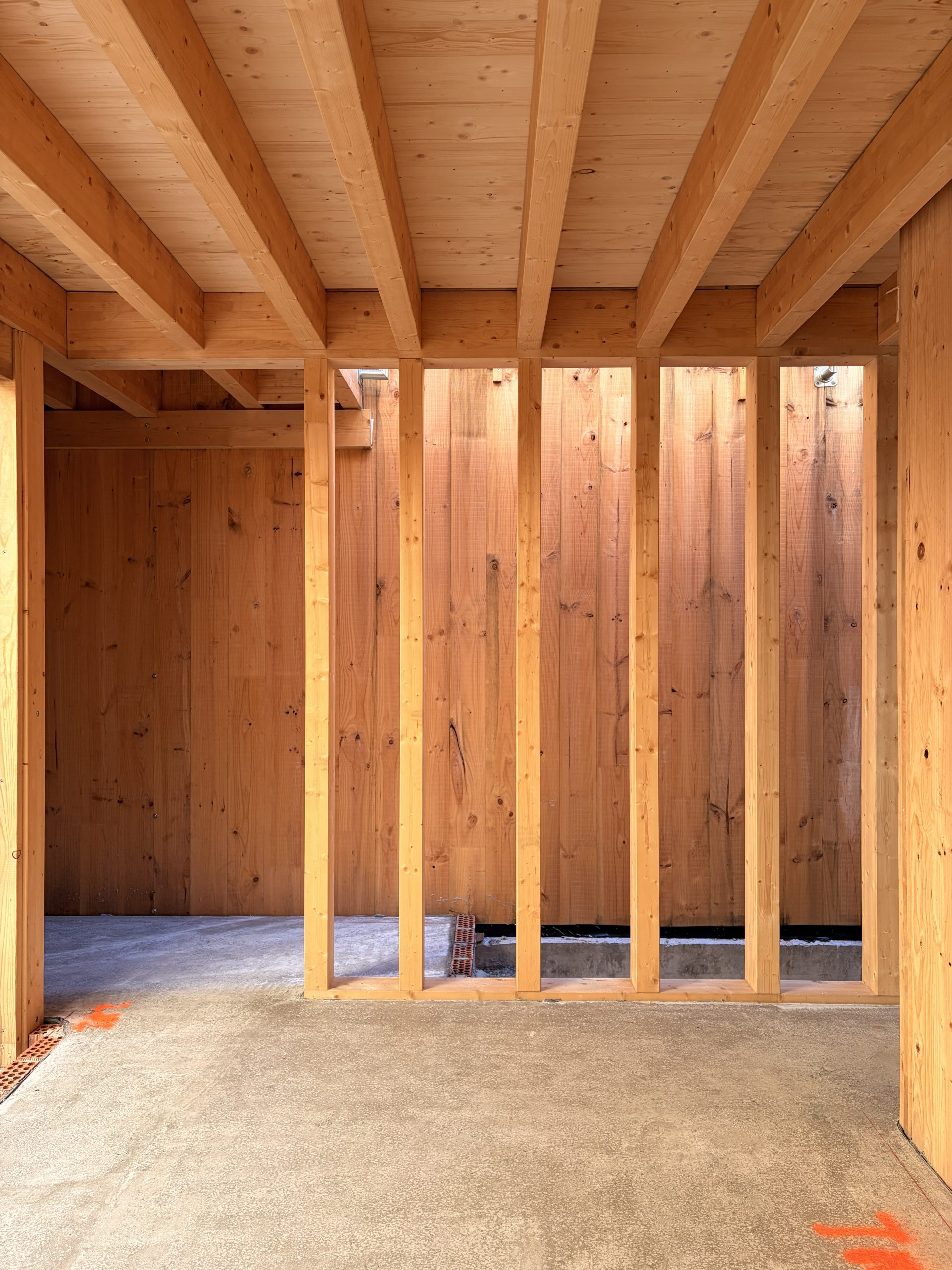 Cada vivienda se vuelca hacia su interior mediante un patio central cubierto por una claraboya, que se convierte en un espacio de uso y disfrute durante gran parte del año. Esta configuración garantiza iluminación natural, ventilación cruzada y privacidad, mientras que las estancias principales —salón y cocina-comedor— se abren completamente a este vacío mediante carpinterías plegables, diluyendo el límite entre interior y exterior.